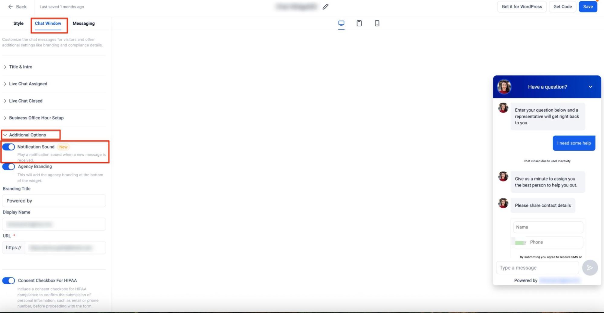 - In Chat Window, go to Additional Options to toggle Notification Sound, which alerts visitors for more messages.