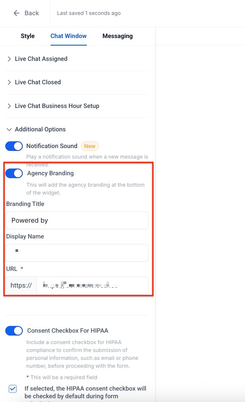 - In Additional Options, you also have the option to add your Agency Branding. This will show your branding including the Title, Display Name and Image that you will add.