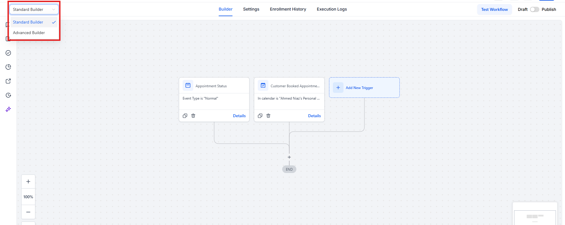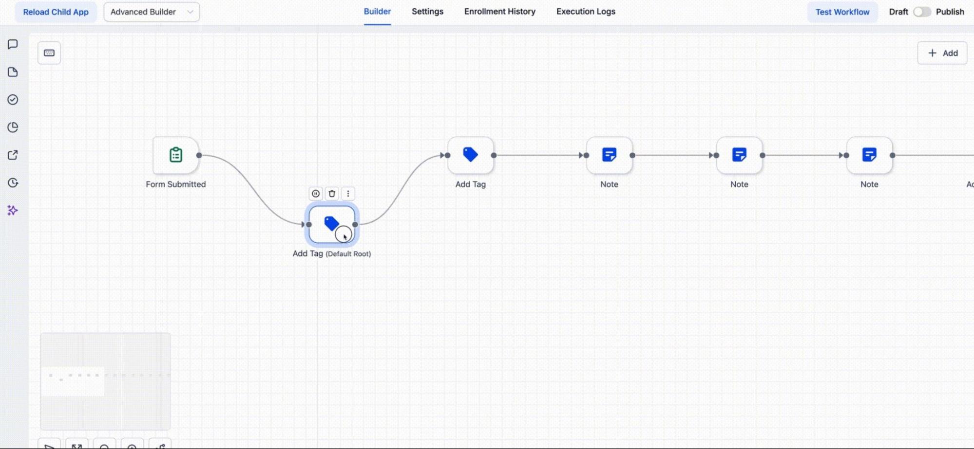 Once you navigate to Tools & Reporting > Automations > Workflows, open your desired workflow and toggle to the Advanced Builder view. This will transition your workflow to the visual canvas, where you can start building and arranging your workflow with ease.