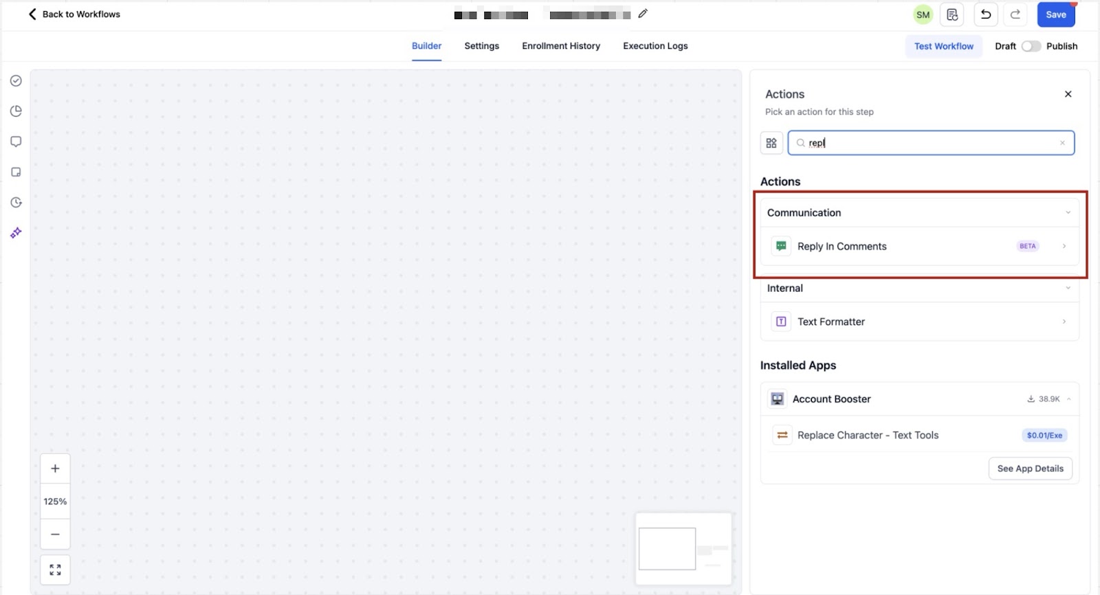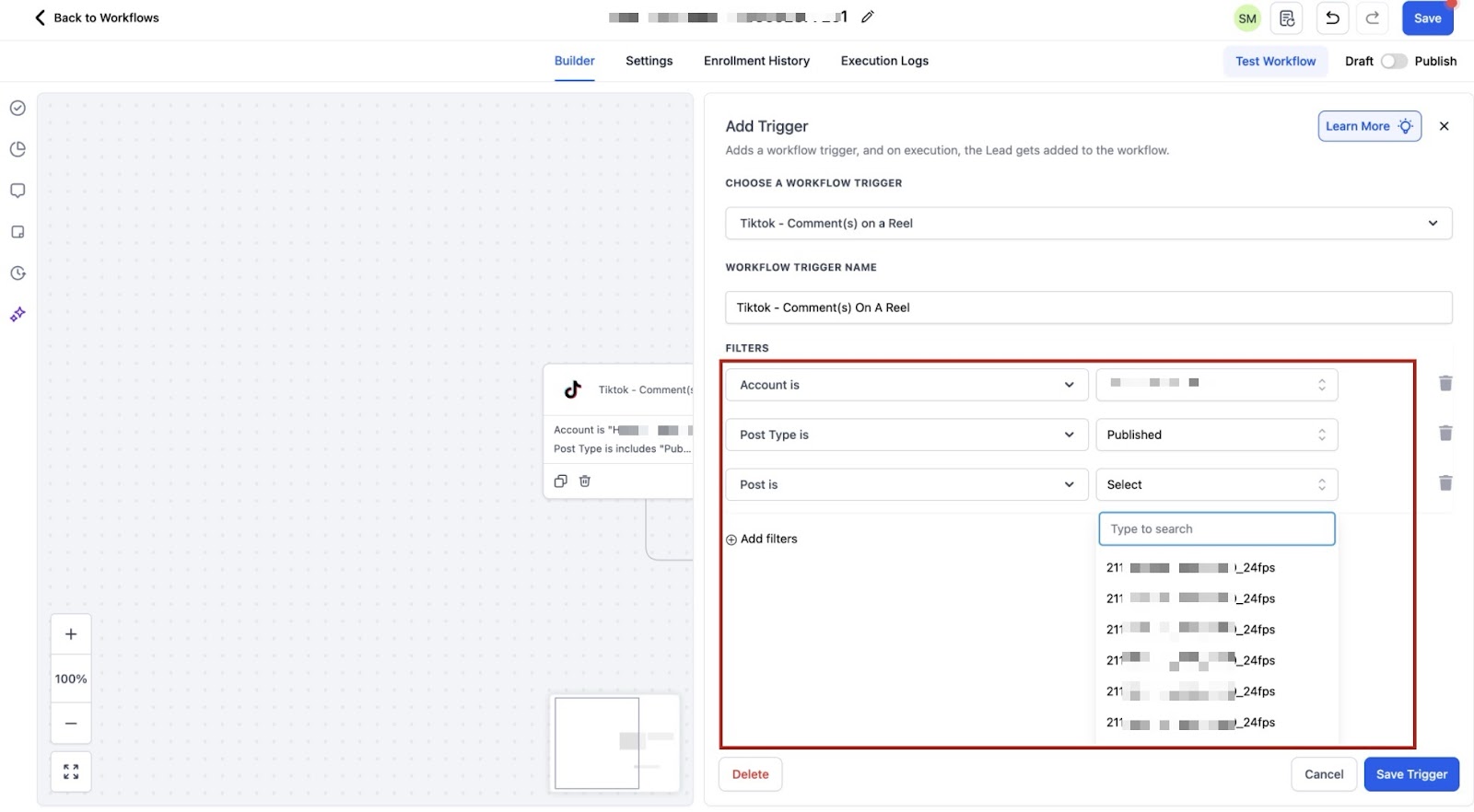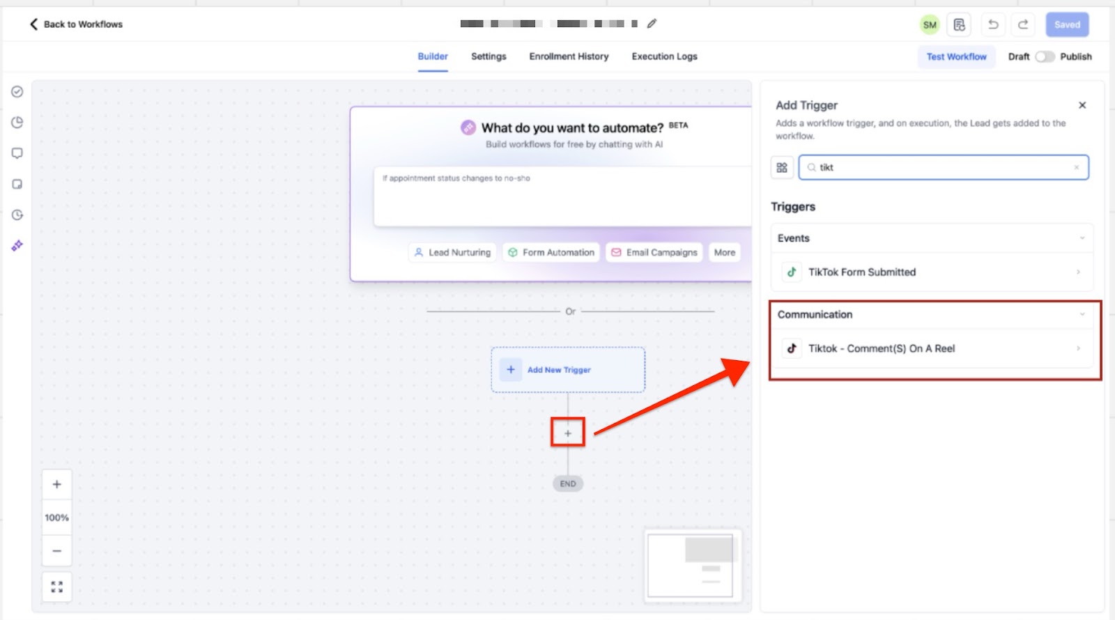 - Do the same: navigate to the Automations > Workflows, but this time choose the trigger as "TikTok Comment(s) on a Reel."