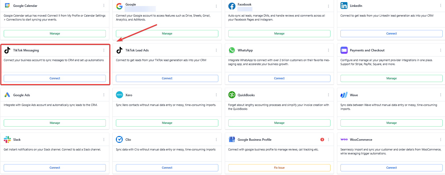 - Go to Settings > Integration, and find and click the Connect button where it shows TikTok Messaging.