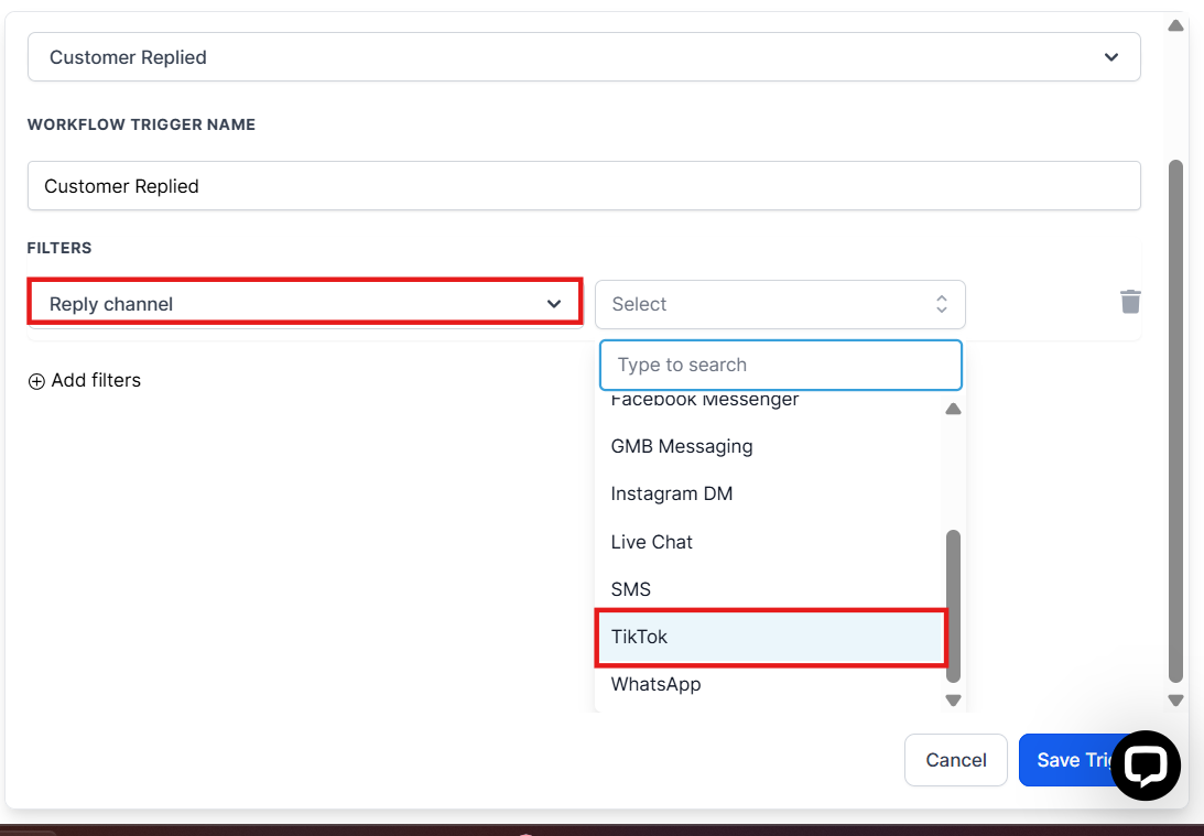 Add a filter "Reply Channel” and then select “TikTok” from the drop-down option to ensure that the workflow trigger works only for the TikTok messages.