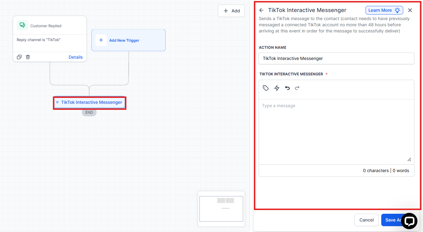 - Create a new workflow or edit the existing one for TikTok DMs by setting the trigger as "Customer Replied."