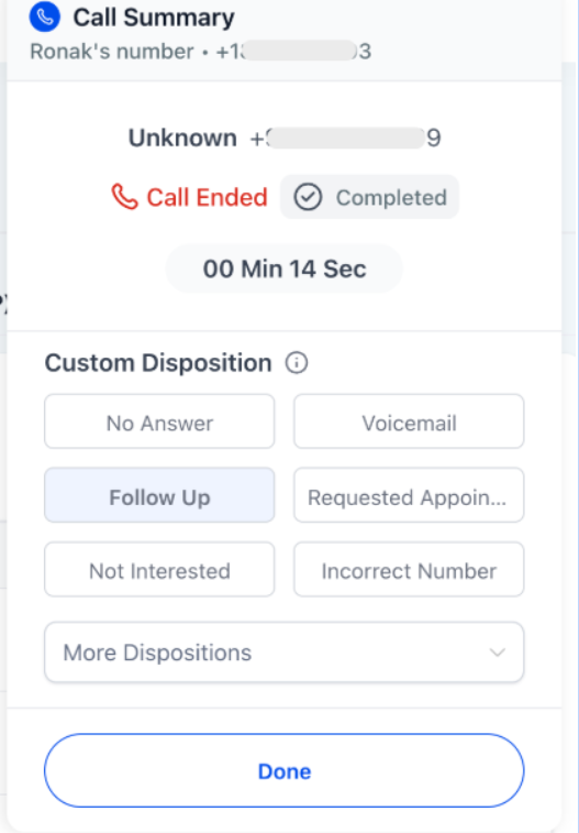 The selected disposition is saved to the contact’s record and displayed in call reporting tables and filters. This ensures consistent tracking, auditing, and insights across all calls.
