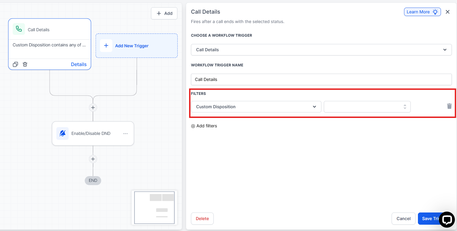 Once a disposition is selected, any workflow configured to react to that outcome will automatically run. This may include sending a message, adding a tag, creating a task, or placing the contact back into a call queue. To set that workflow trigger, you will need to navigate to Automation > Workflows > Select one of the existing workflows or create a new one. Then add the trigger: Call Details > Add the filter: Custom Disposition.