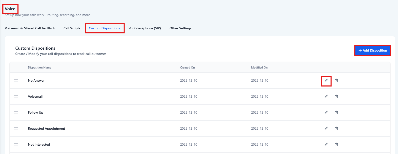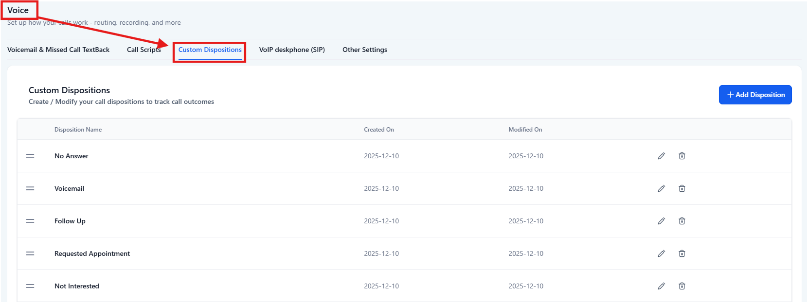 Go to Settings → Phone System → Voice → Call Dispositions.