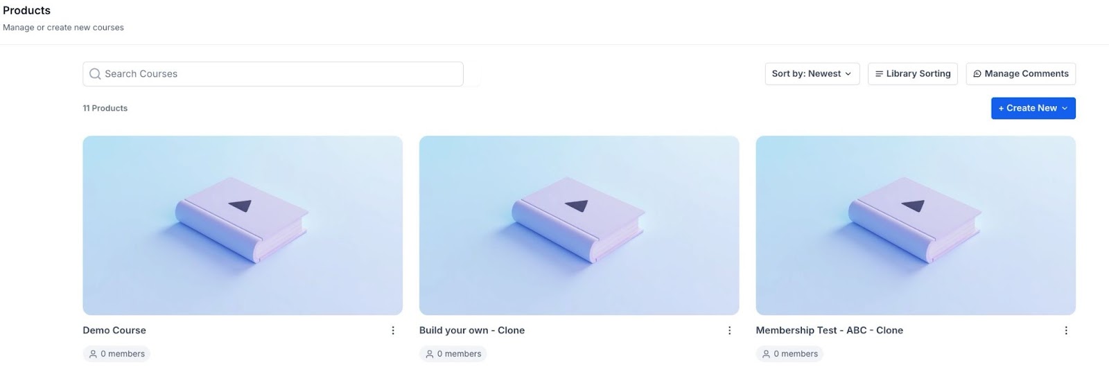 - Choose the Product you wish to apply a theme for by navigating to Your Products on the left > Courses at the top > From the dropdown select Products.