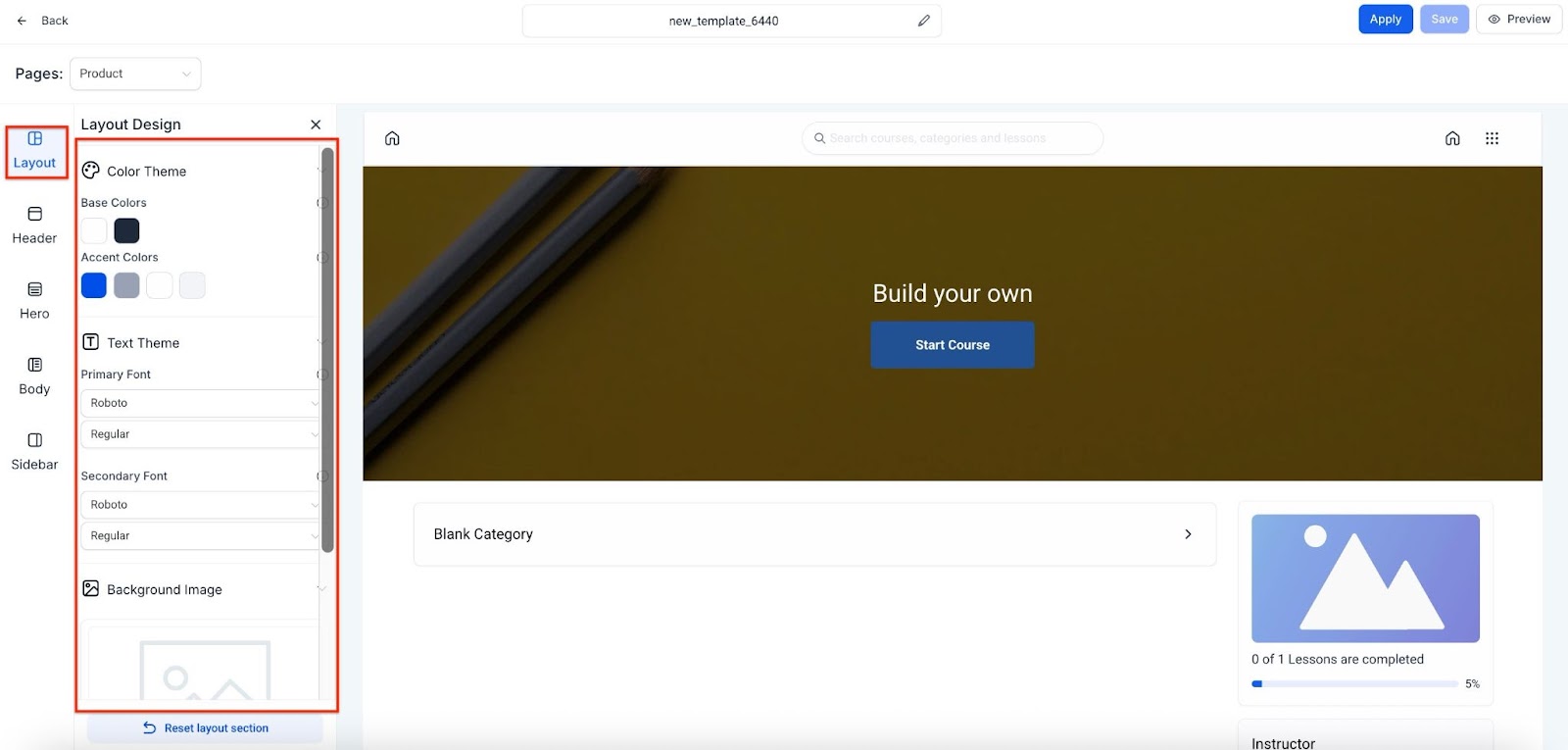 - When you use the “Apply” button for a theme, it will be applied to the selected product, and any other customization you’ve done within that product won’t automatically save globally.