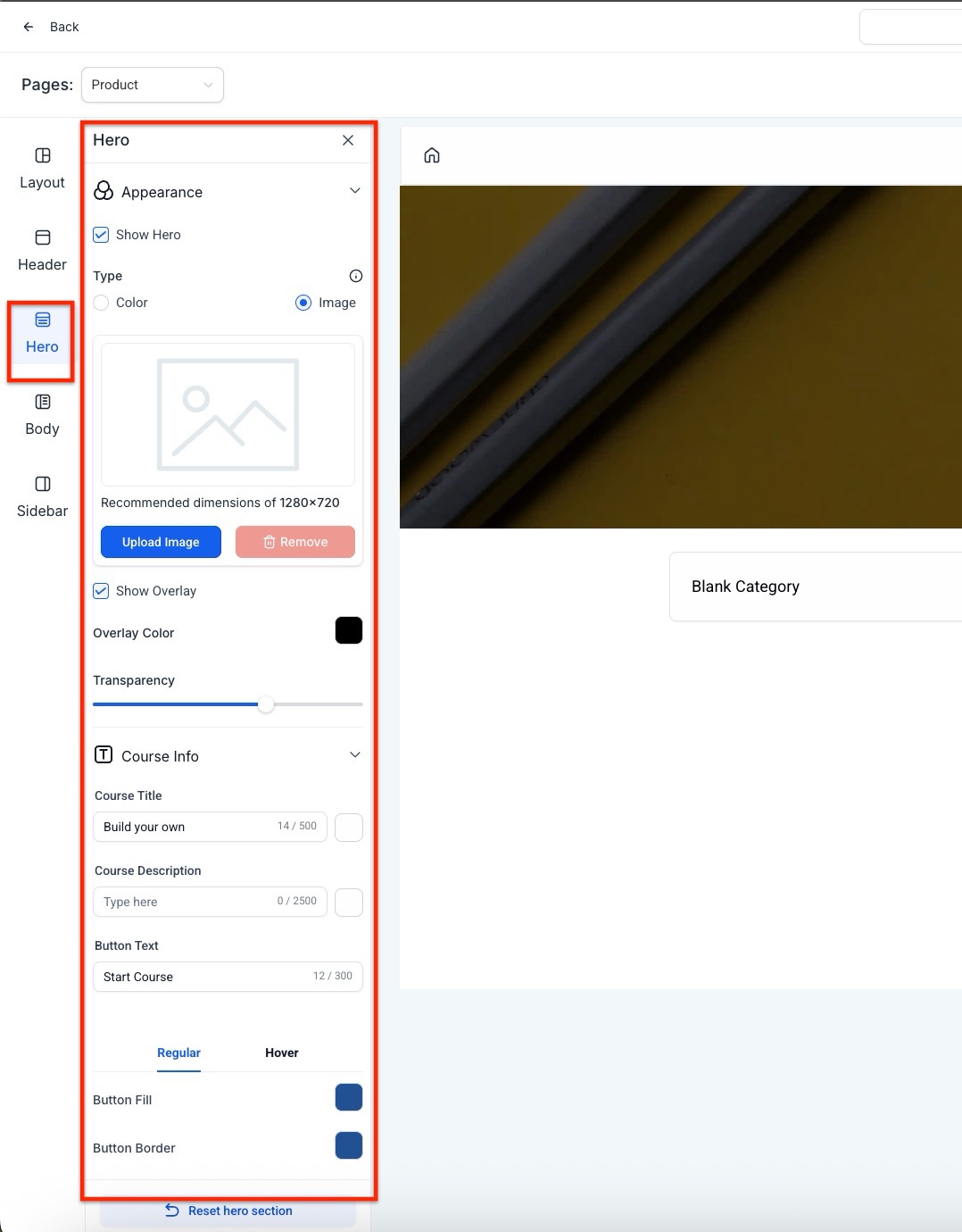 If you wish to customize a specific section of the page, click on the Section in the sidebar editor on the left-hand side. Within the Section, you can see all the customization options.