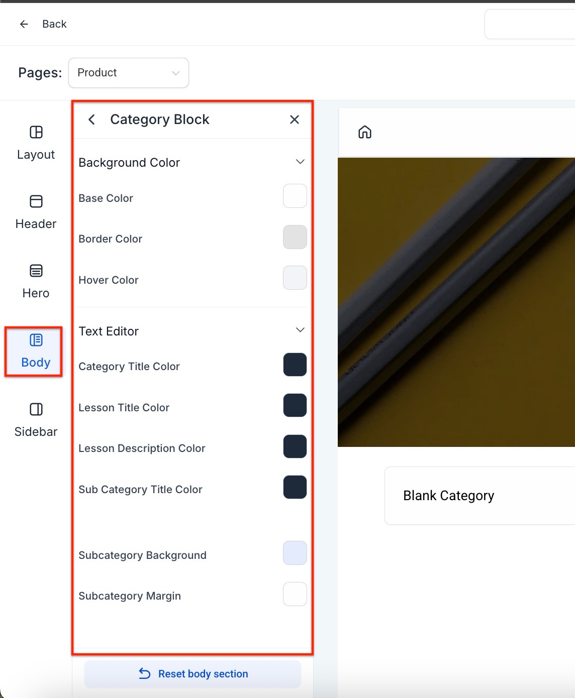 - Course Body: category and subcategory fonts, description and lesson fonts, background