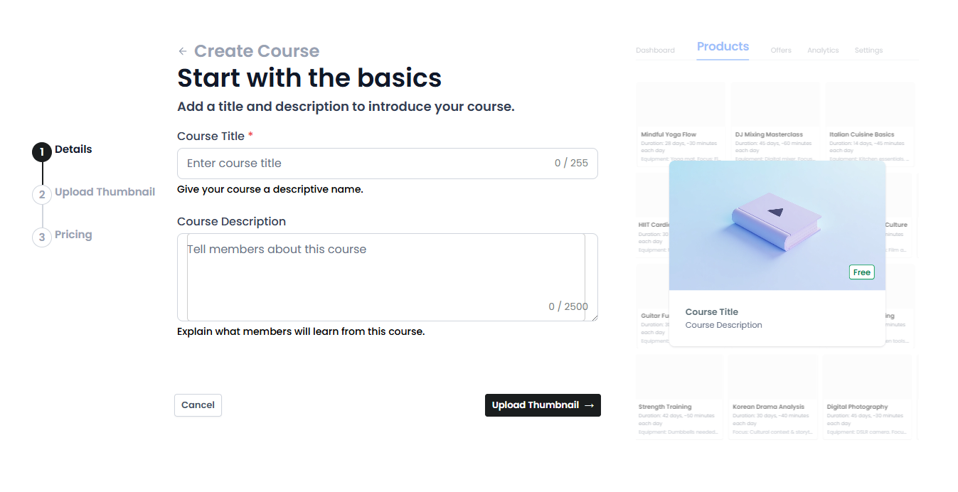 - If you create a new product, you can choose to start from scratch or import one that you previously created from Kajabi.