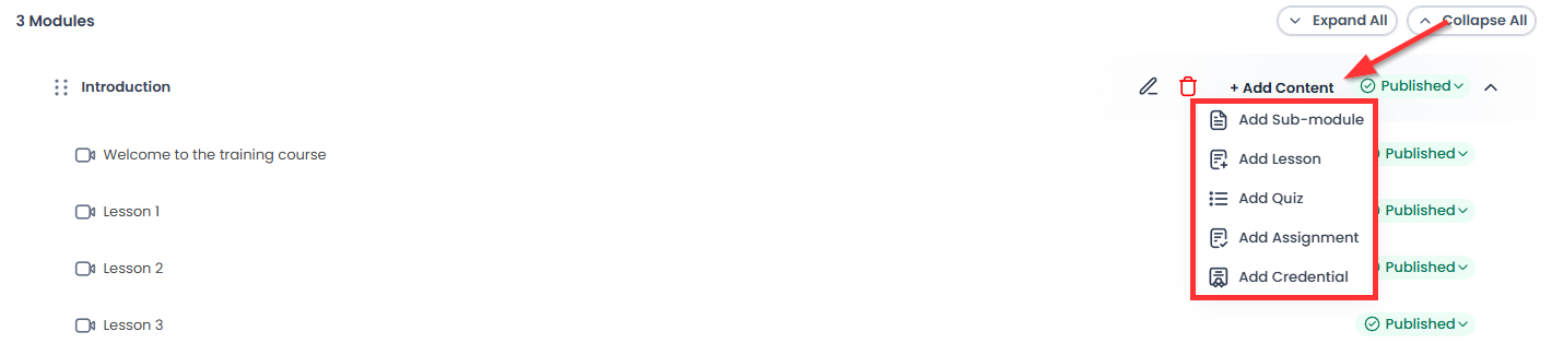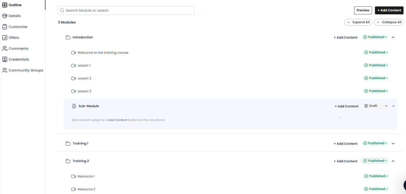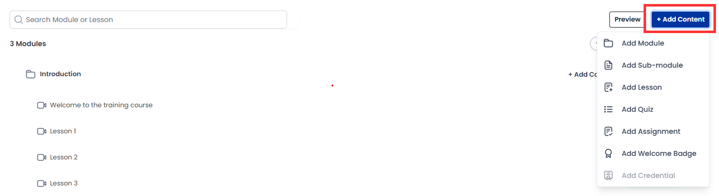To add a new module or sub-module, select the +Add Content" option in the upper right: