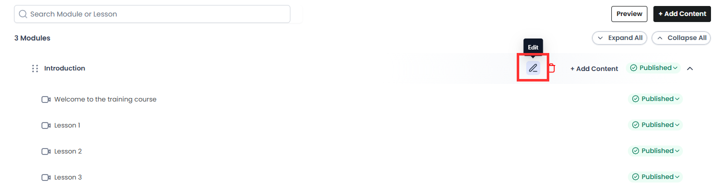 To edit a module's title, description and thumbnail, hover over the module you'd like to update and select the pencil/edit icon: