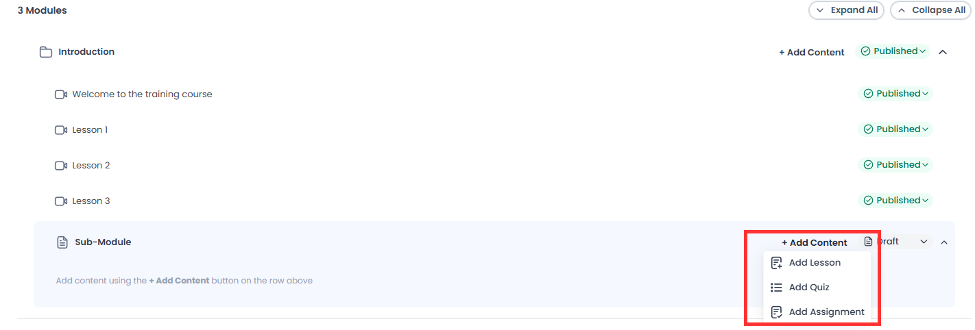 You can also nest content within a sub-module. You can add lessons, quizzes and assignments.