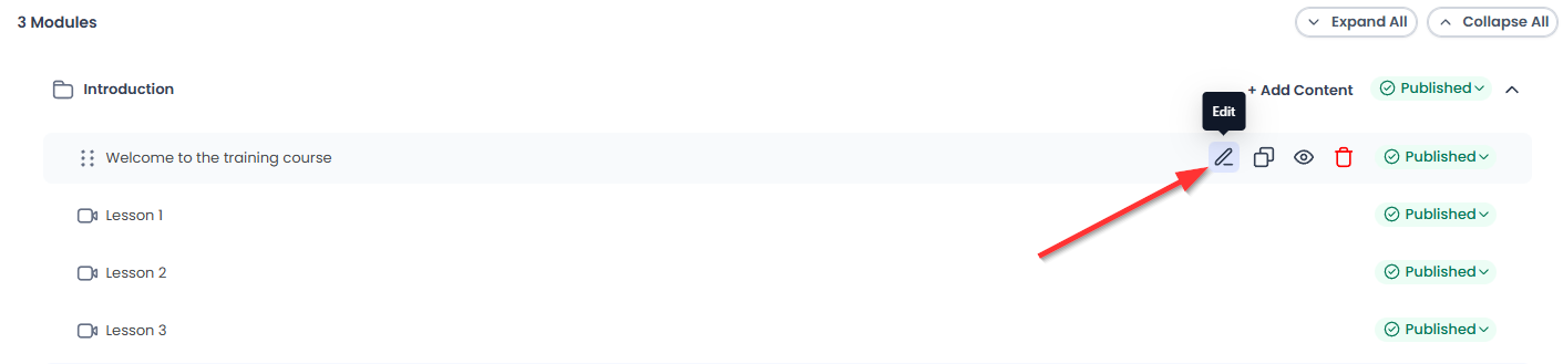 - To edit an existing lesson, hover over the lesson and select the pencil icon: