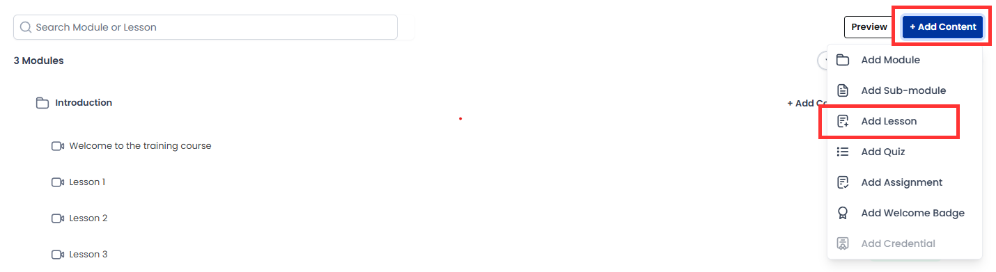 - To add a new lesson under a module or sub-module, you can either select "+Add Content" to the right of a module/sub-module, or click "+Add Content" in the upper right corner of the course outline.