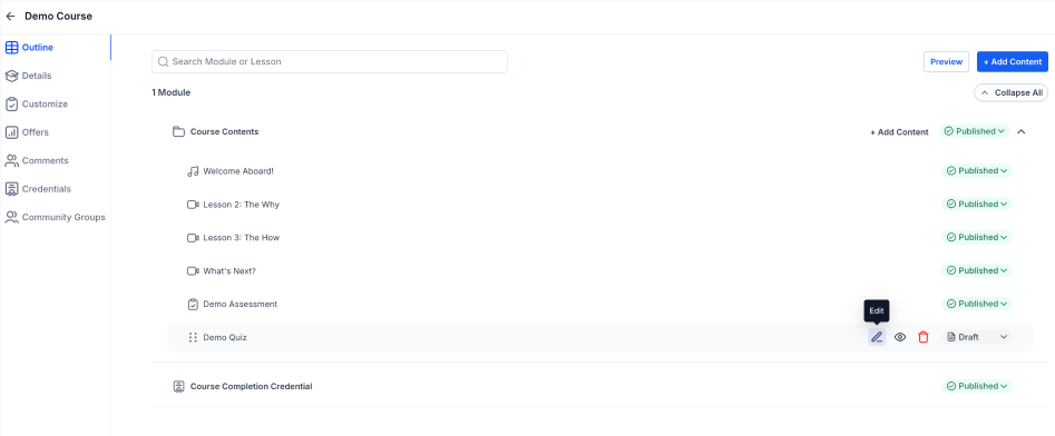 To add a quiz, go to Your Products > Courses > Products. Choose the product, click the plus sign next to the section title, and select “Add Assessment.” Choose quiz as the type, add your questions, configure the passing grade requirements, and publish when ready.