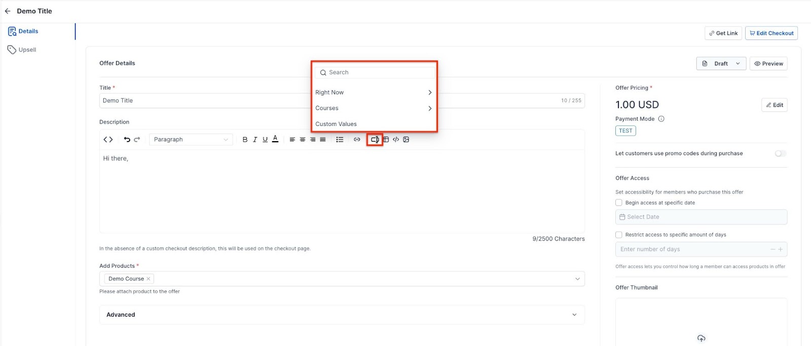 - You can also add custom values to elevate personalization capabilities, including contact-specific, time-based, course-specific, and location-specific options. These custom values can be seamlessly applied to post descriptions, offers, offer descriptions, and quizzes, enabling businesses to deliver tailored experiences with ease.