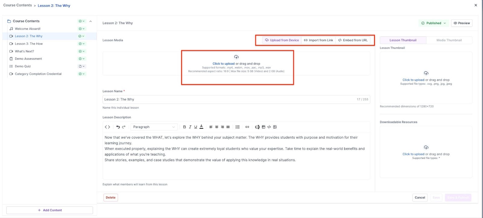 - Add Media via Links: If you would like to add media to your offer, you can embed audio or video content directly into lessons by providing downloadable URLs, enhancing the learning experience.