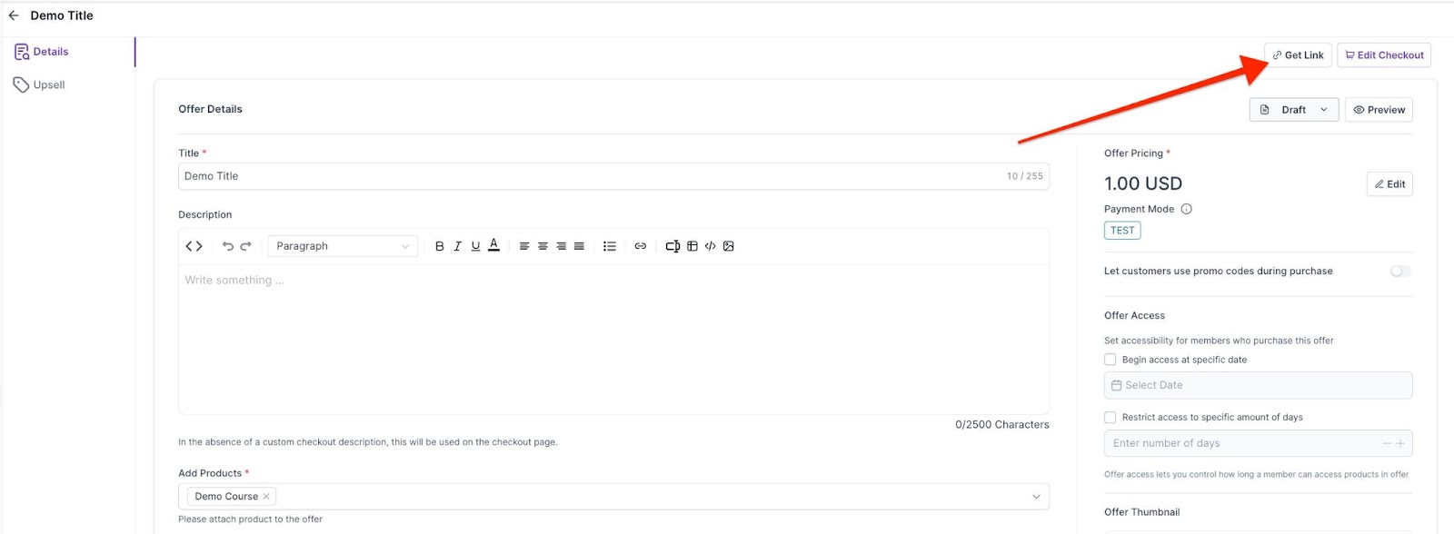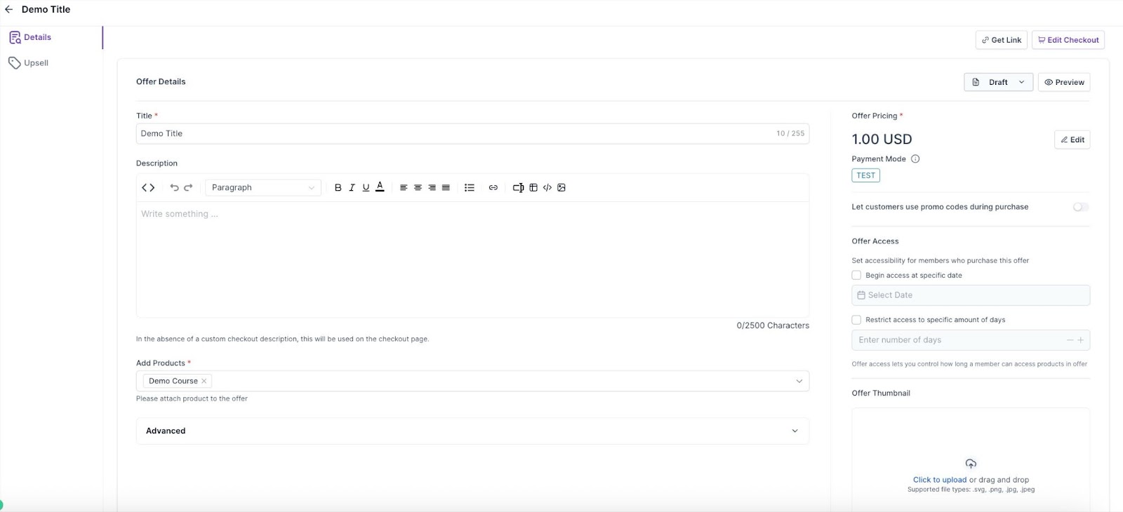 - Give a title to this offer, connect it with a product, and give it a price. All offers linked to the product will show in the offer tab on the membership products page.