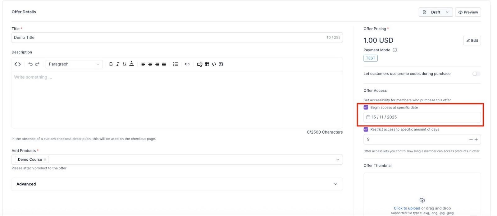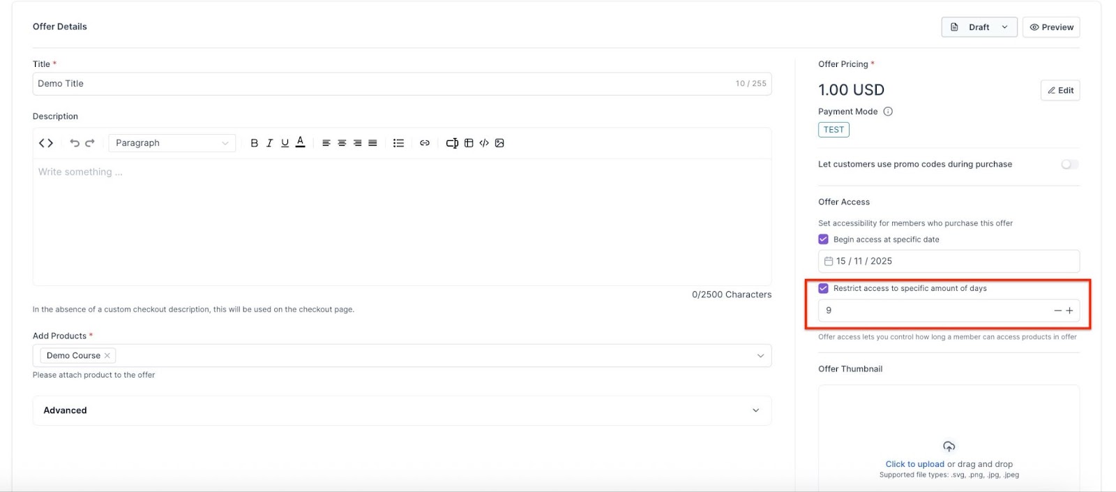 - Access Duration Settings: In the offer details page, find the section labeled "Offer Access," and check the box "Restrict access to a specific amount of days."