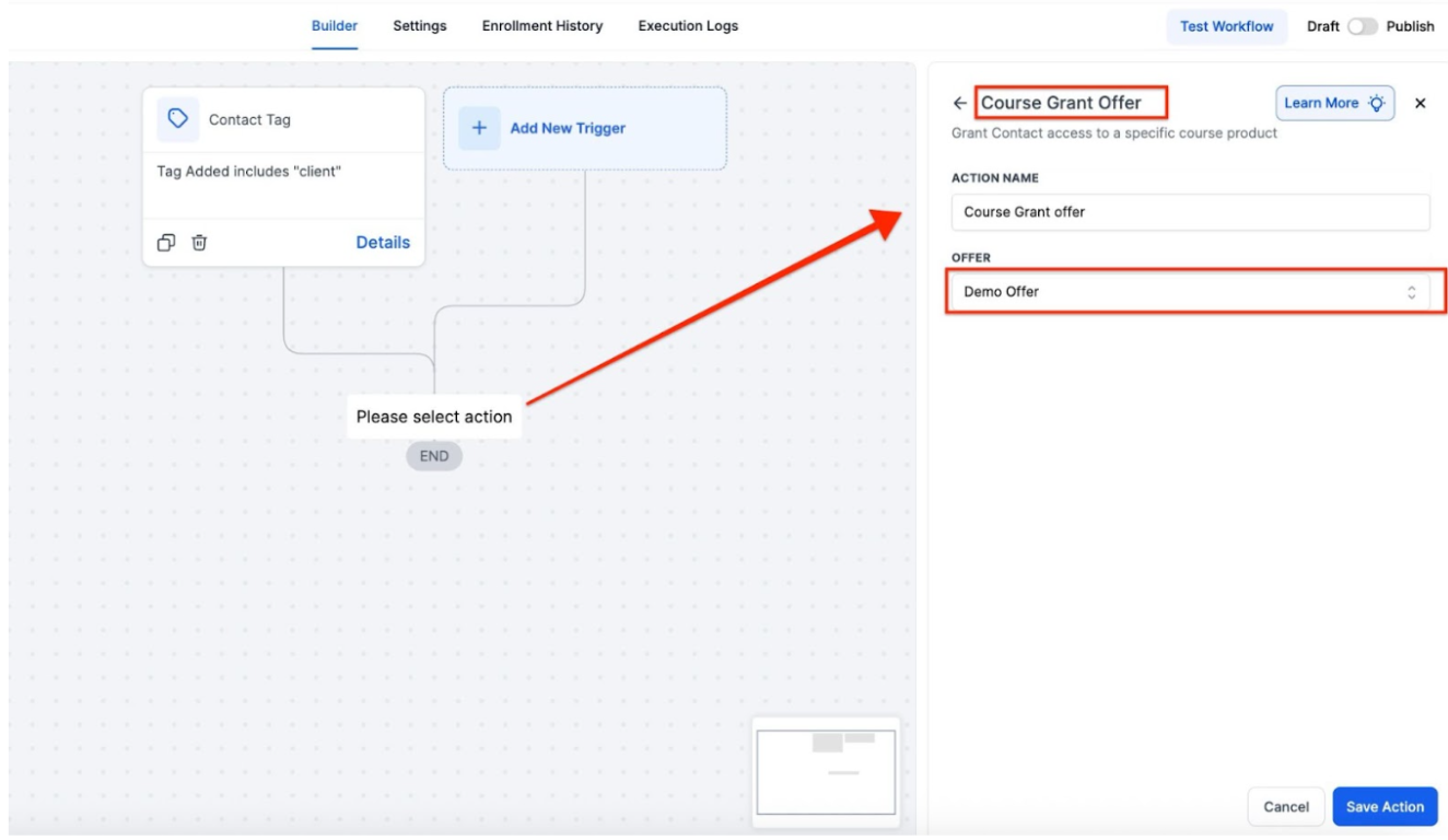 Add the Product Grant Offer action to add the contact to the offer and included product.