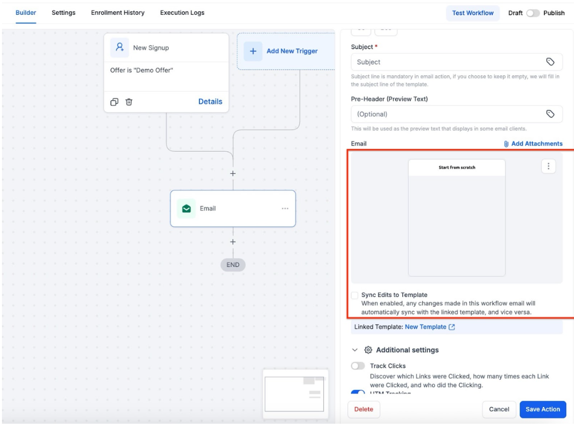 - Add the Send Email action and either use a template that includes membership custom values or build one within the workflow email builder.