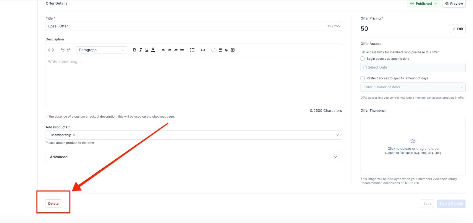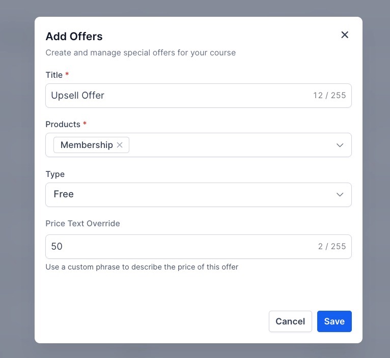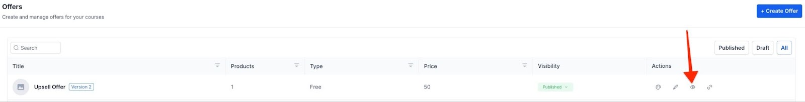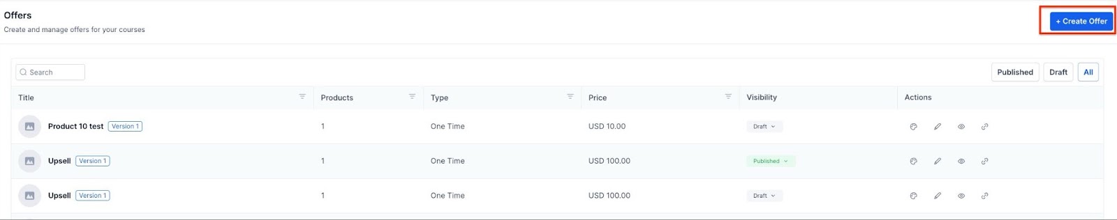 - Create an offer to use as your upsell. Go to Your Products on the left > Courses at the top > From the dropdown select Offers