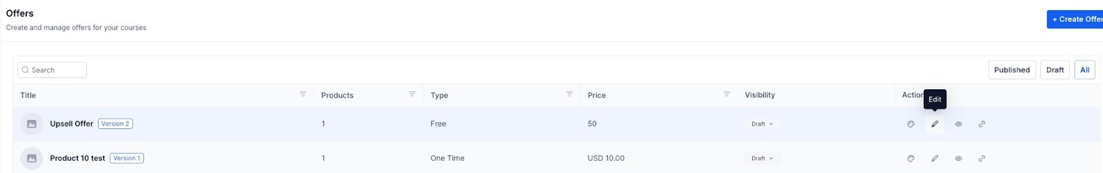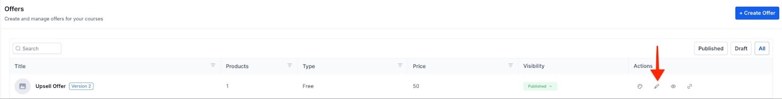 - Click the customization/edit (pencil icon) button from your offer list to access your Upsell Offer.
