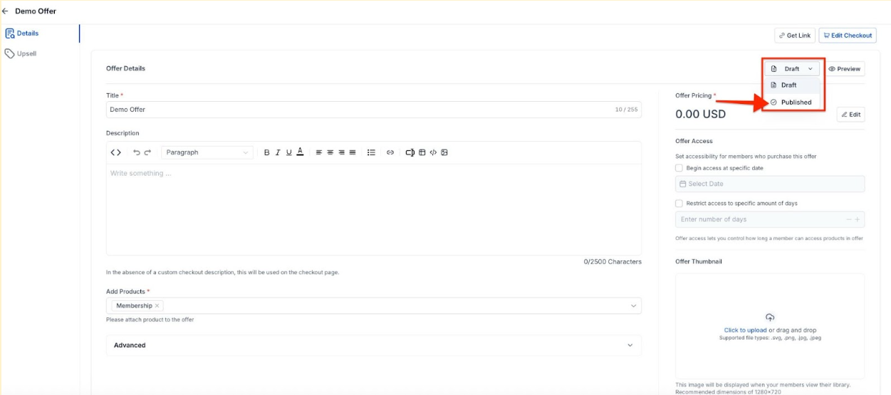 - If you don't publish your membership offer, it will remain in the "DRAFT" tab, and it won’t be available for selection in your products or funnels. Make sure to publish the offer for it to be active and selectable.