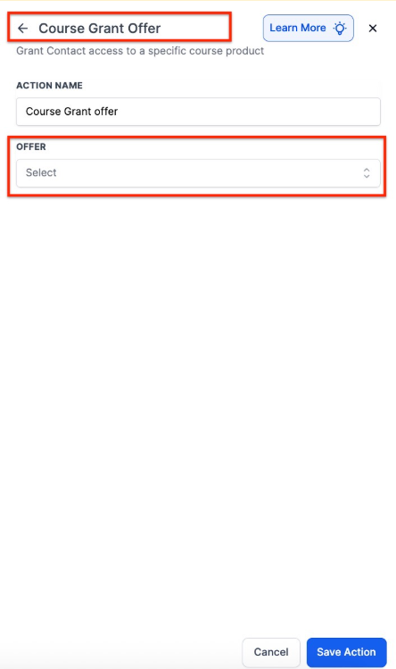 - Select the action “Course Grant offer” and choose what offer to grant.