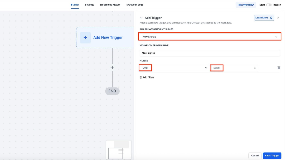Note: You can select an offer if you want to trigger the workflow for any specific offer.