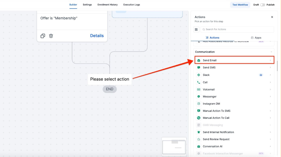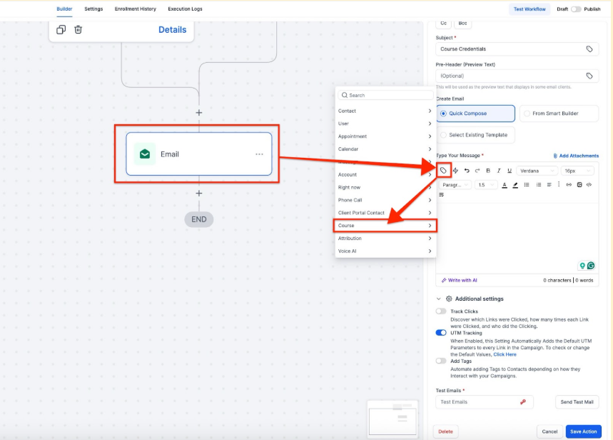 - Add the Send Email action and either use a template that includes Course custom values or build one within the workflow email builder.
