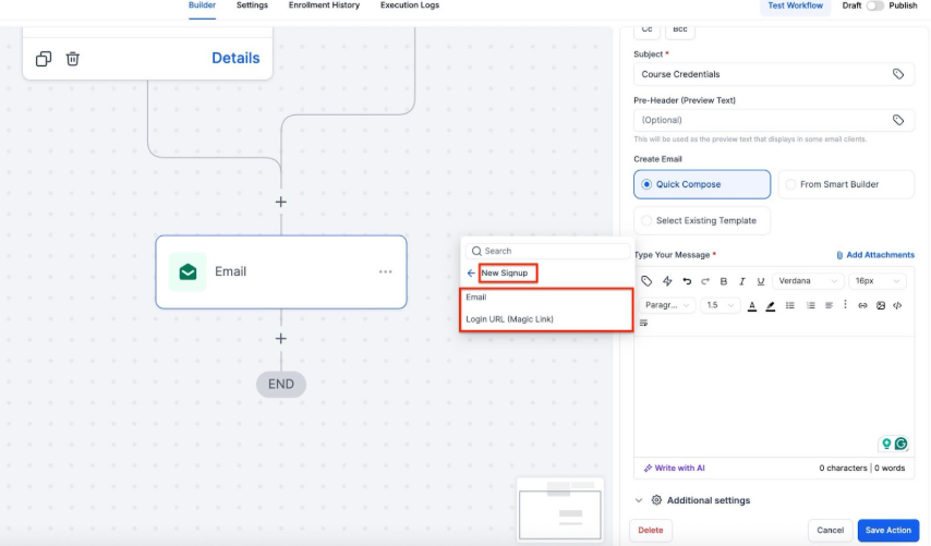 - Under the email action, click on the custom value option > Course > New Signup and select the values ‘Email’ and ‘Login URL(MAGIC LINK)