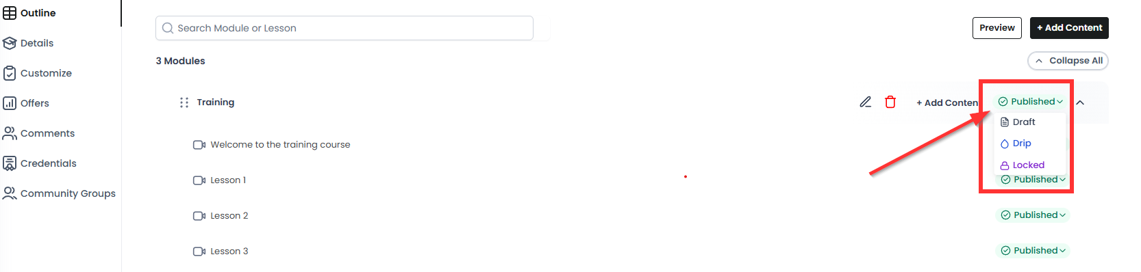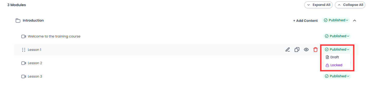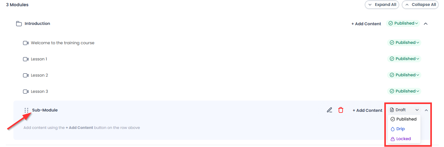 When creating a course, next to the module, you will see a drop-down menu with 4 different statuses: Published, Draft, Locked, and Drip. In this article, you will learn the difference between these statuses.