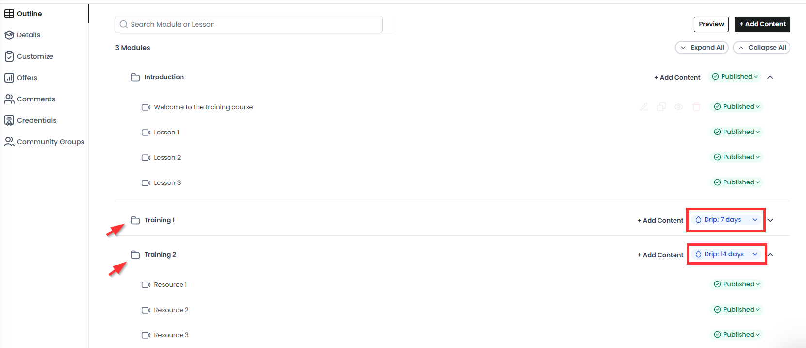 So, in the example below, Training 1 has a 7-drip delay, and Training 2 has a 14-drip delay. This means that after the member logs in for the first time, after 7 days, they will have access to Training 1. In 14 days, Training 2 will be available.