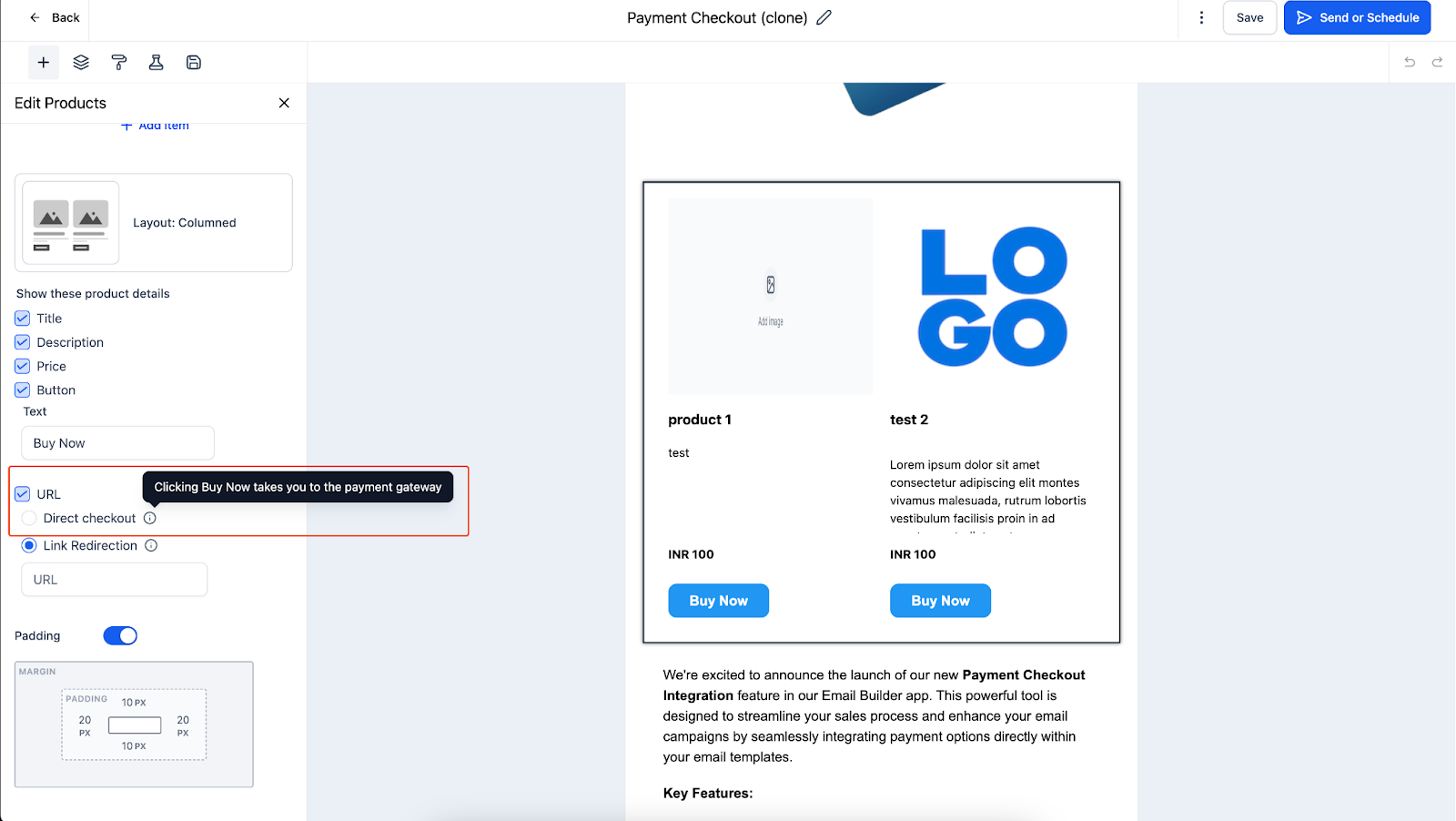Q: How can I add product elements with direct checkout links to my email campaign?