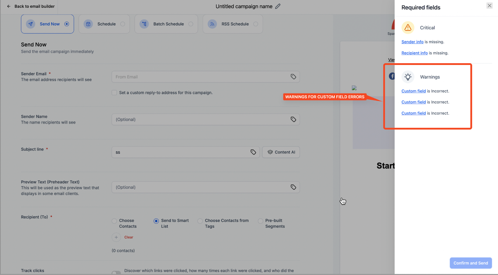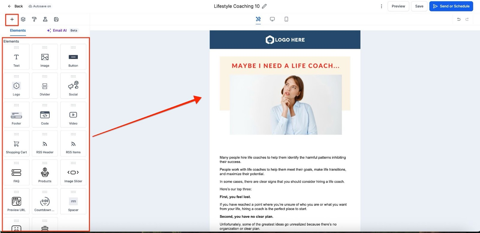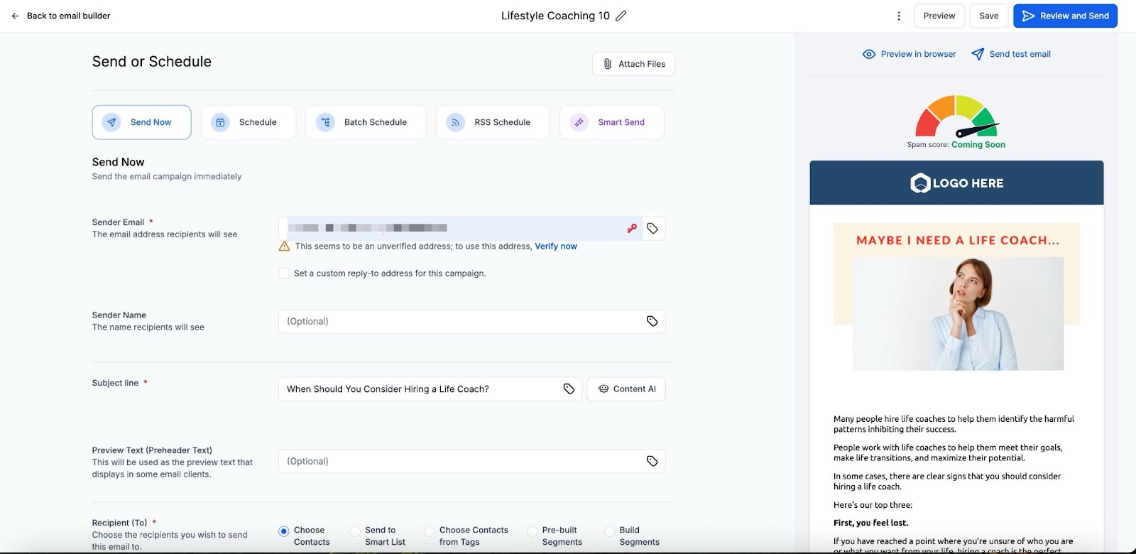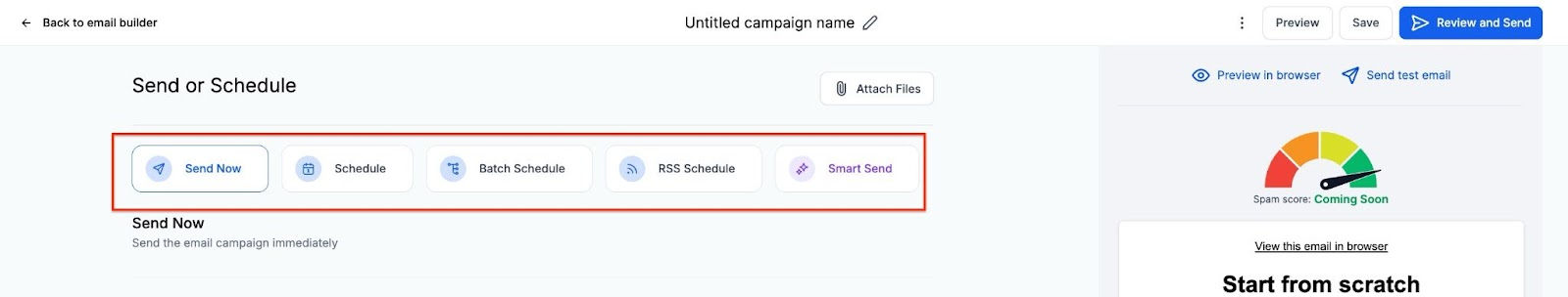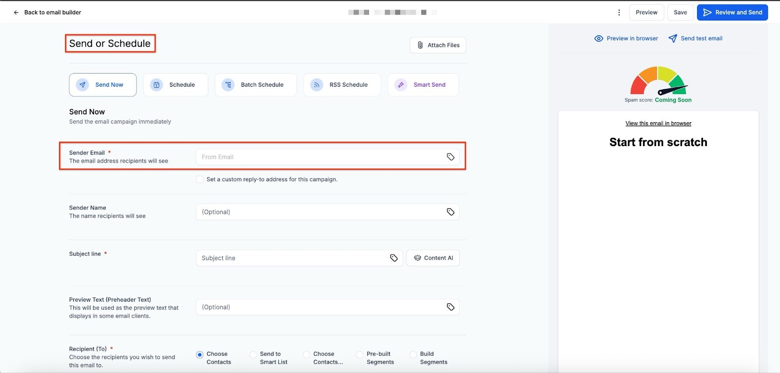 Once your email campaign is ready, click on "Send or Schedule," fill out the recipient details, add a subject line, and choose to either send the email immediately or schedule it for a later date and time.