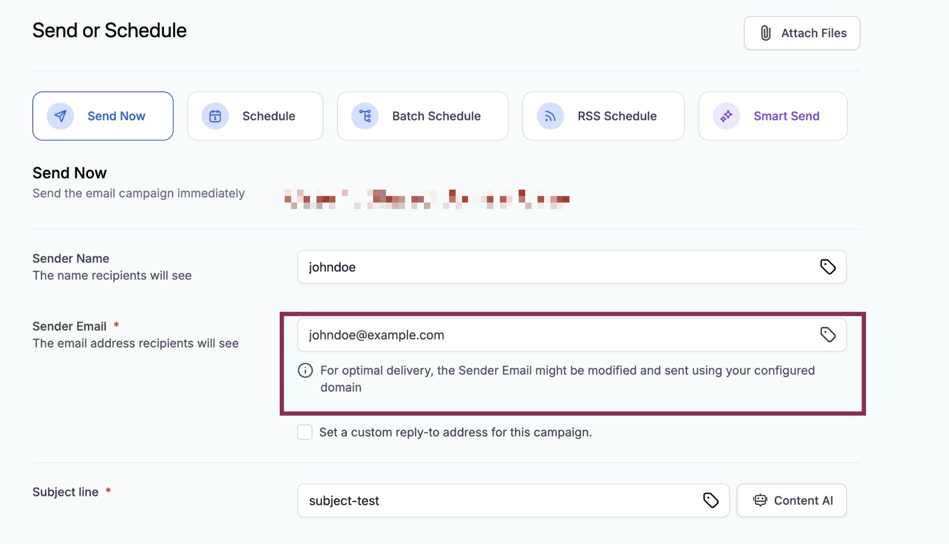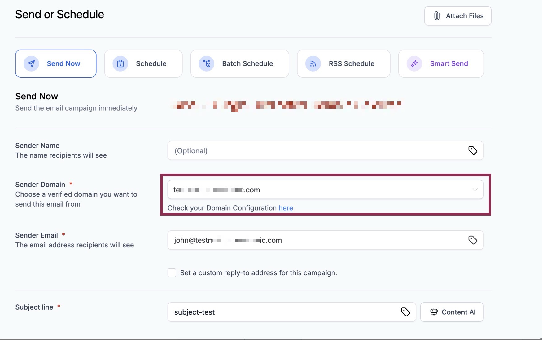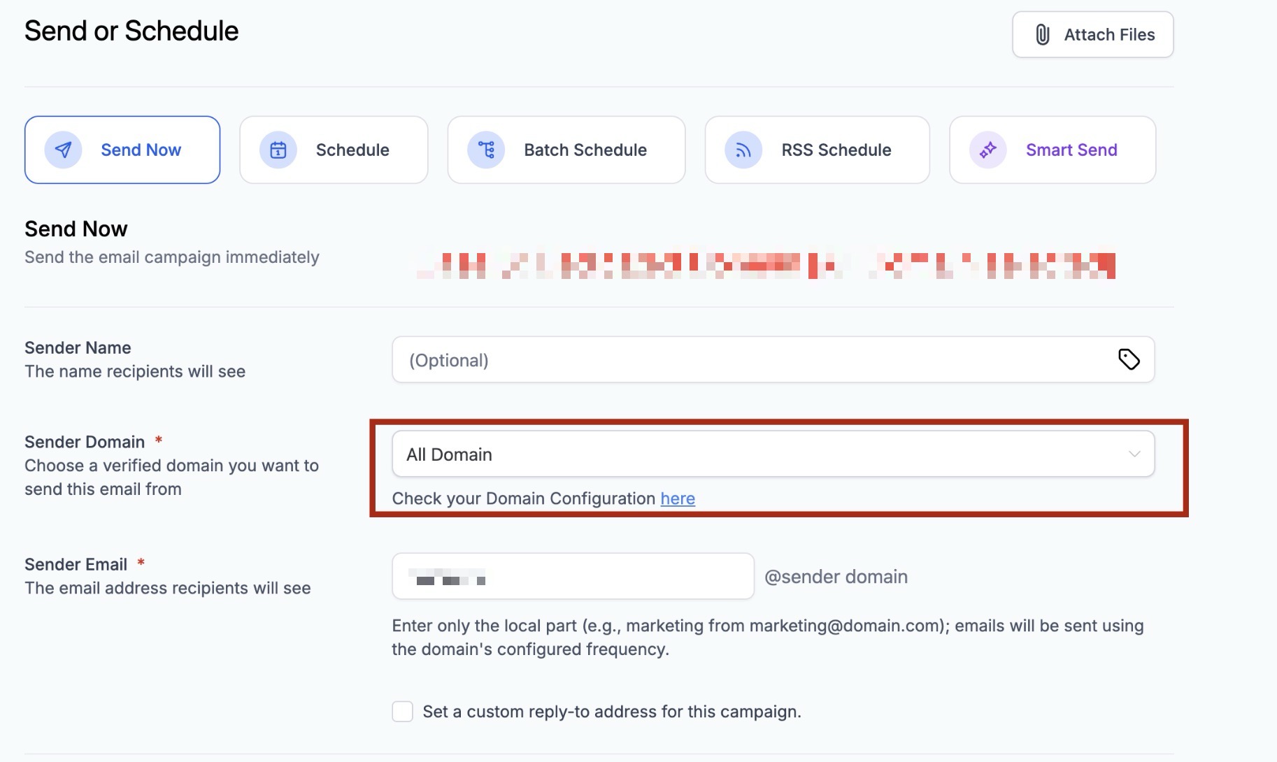 - You also have the ability to choose the sender domain for your campaigns. If using a public or shared email, the system will automatically adjust to ensure compliance, avoiding campaign failures. Note: This is for LC Email only.