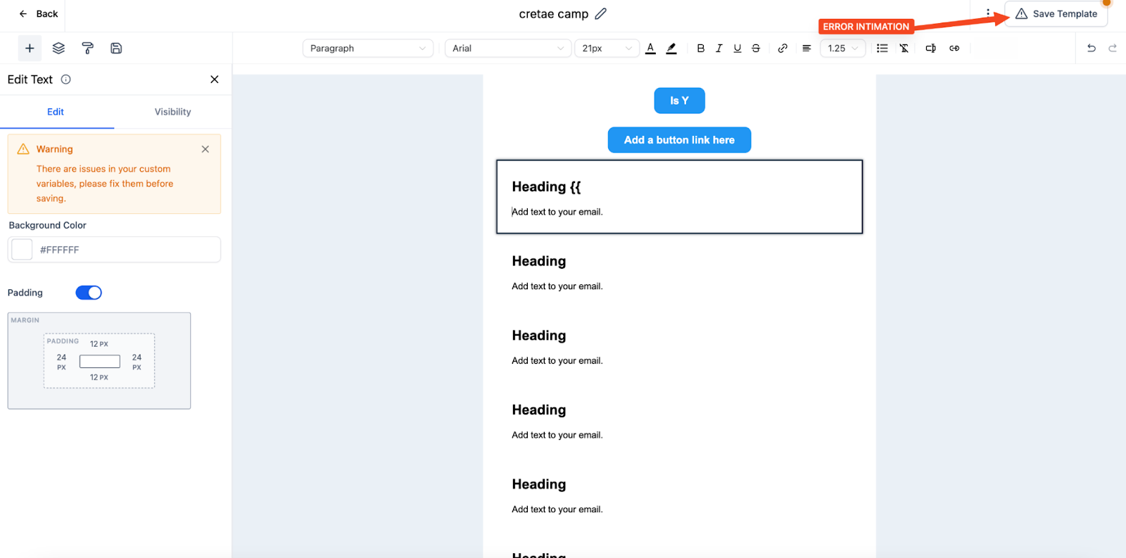Answer: If a syntax issue is detected in your custom values, a warning will appear at the top of the email template. You can click on this warning to be directed to the specific area that needs correction.