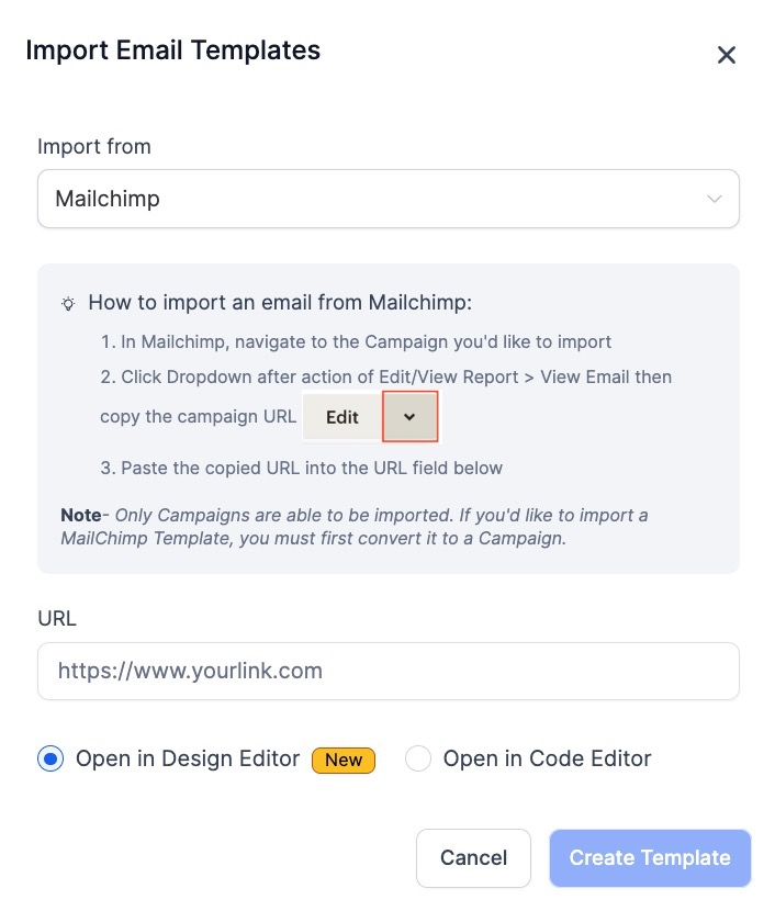 Note: Only campaigns can be imported. If you’d like to import a Mailchimp template, you must first convert it to a campaign.