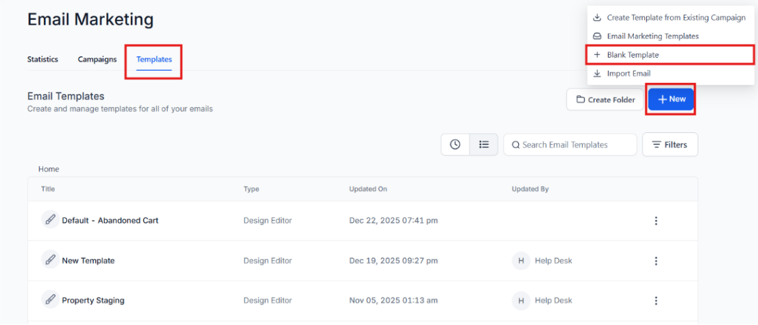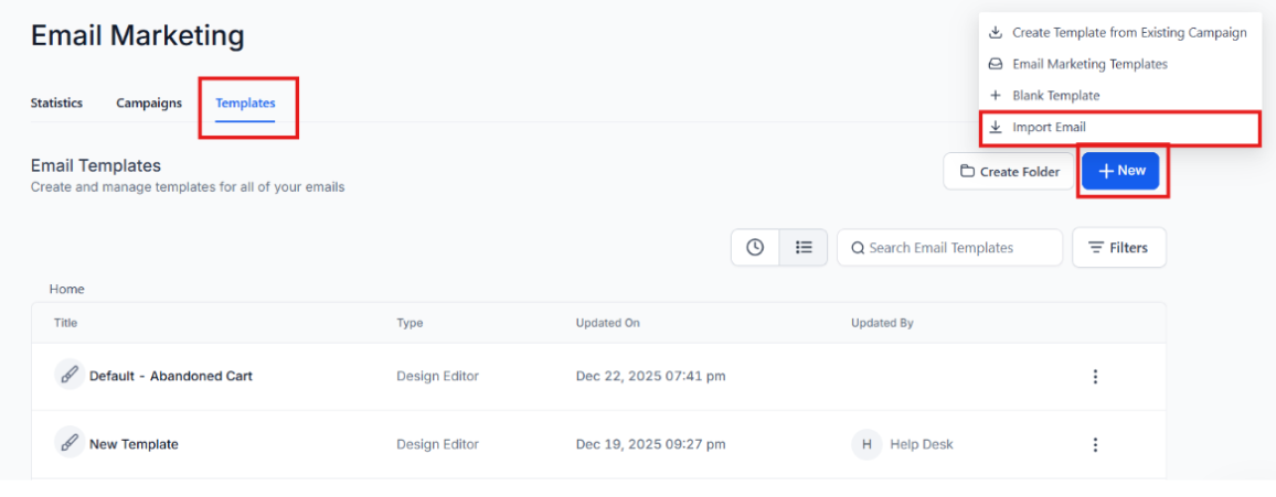 - Click on + New to create a new email template.
