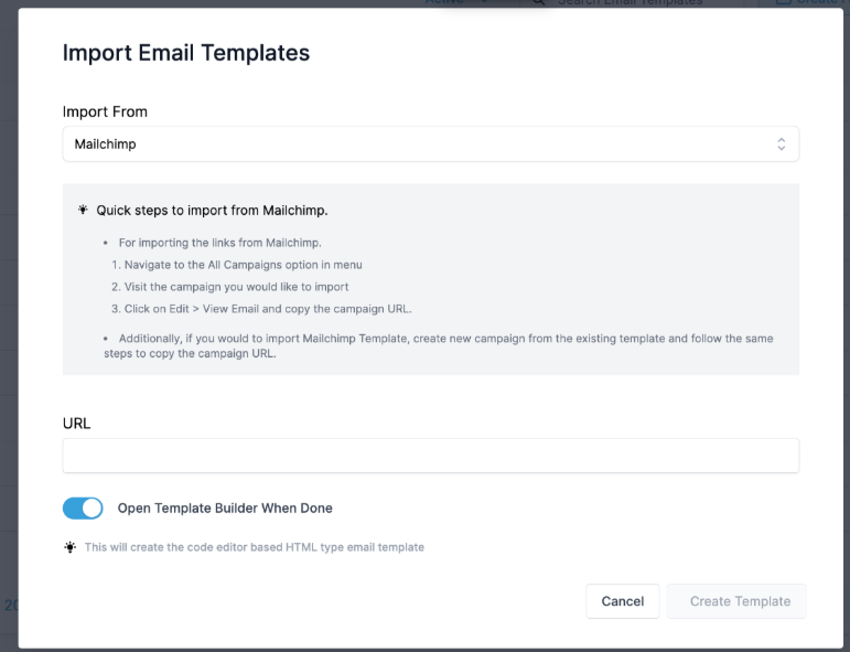 2. How do I import a Mailchimp template into Mastermind? To import a Mailchimp template, you must first convert it into a campaign in Mailchimp. Navigate to the campaign, click Edit/View Report > View Email, copy the campaign URL, and paste it in the URL field in Mastermind under Emails > Email Templates > Import Email.