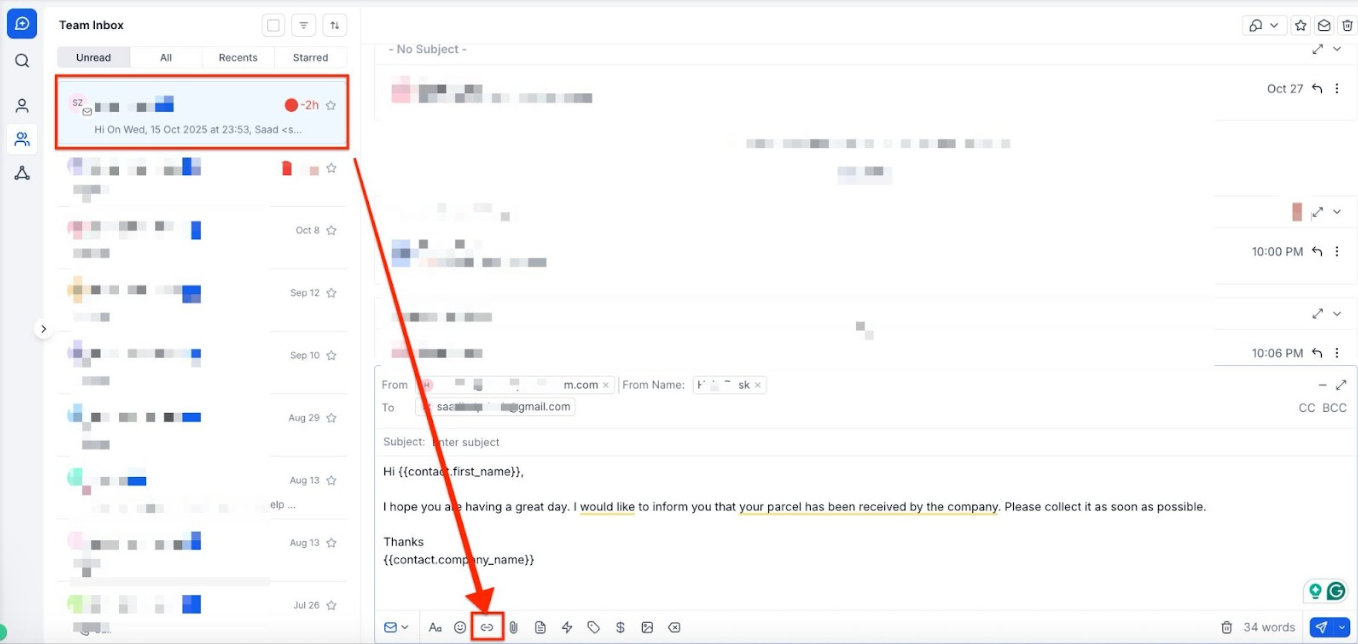 - Alternatively, navigate to “Conversations” to view a specific conversation, and select the email tab. Click on the icon at the bottom of the screen to add a Trigger Link.
