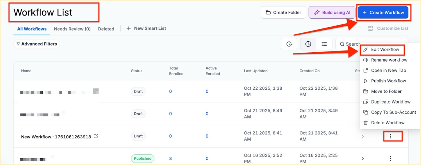 - Navigate to Automation > Workflows and hit the “+ Create Workflow” button or edit an existing workflow