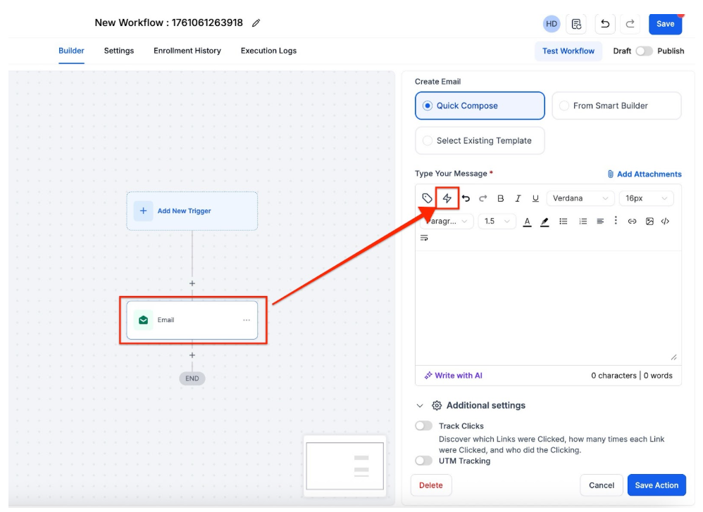 Go to Automation > Workflows, create or edit a workflow, and add or edit the Send Email action. Use the Trigger Links dropdown to select and auto-populate the URL value. Save the changes to the link, action, and workflow.