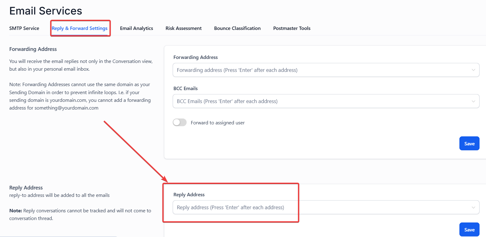 To change or remove the custom reply-to address, follow the same steps to navigate to Settings > Email Services > Reply and Forward Settings, update or delete the address, and then click Save.