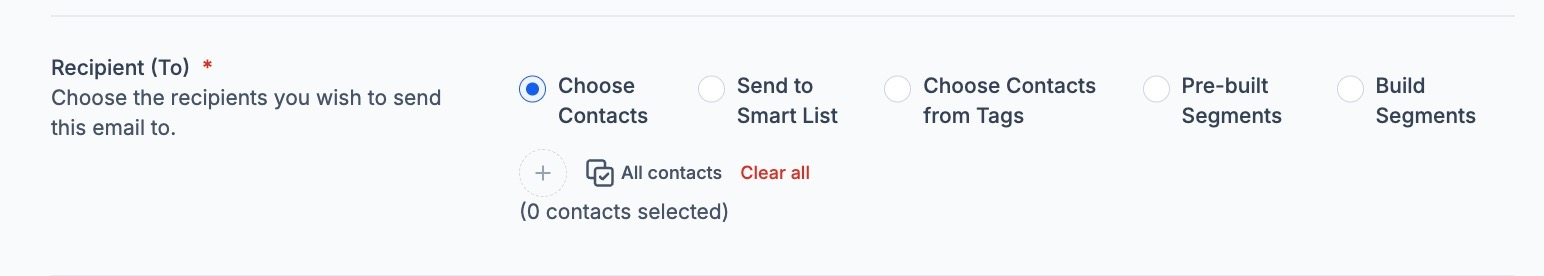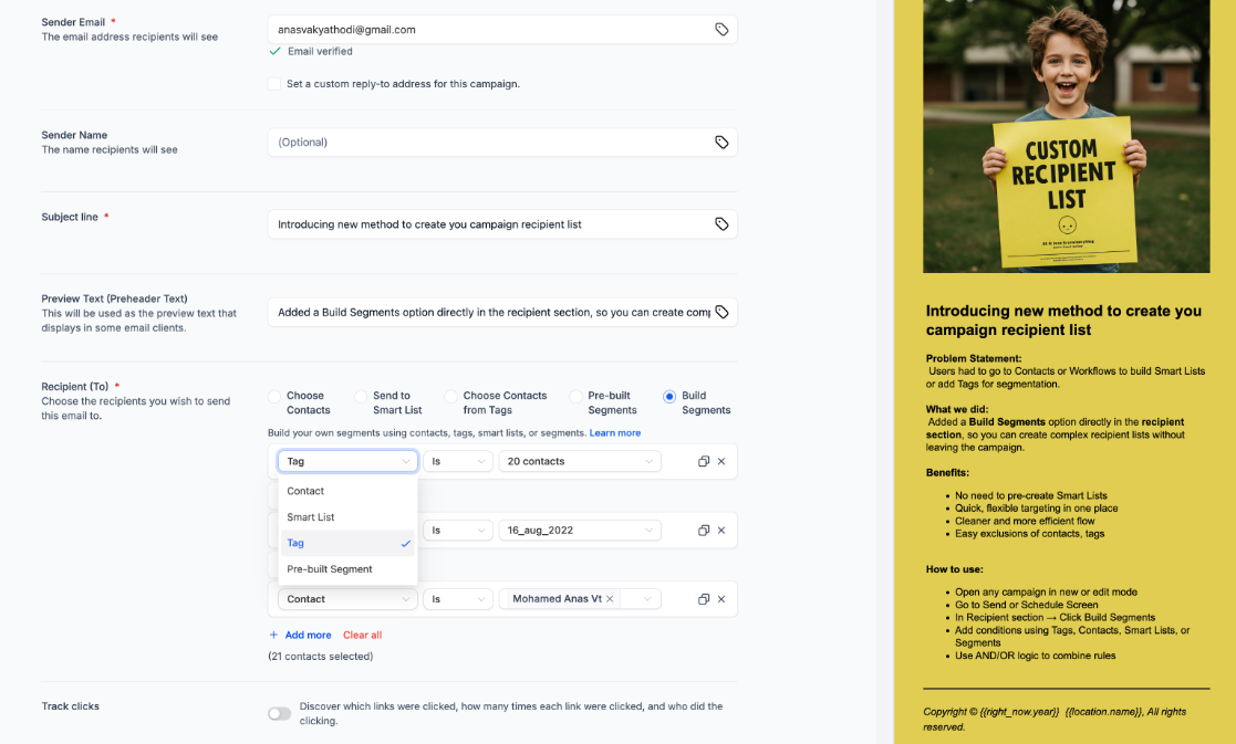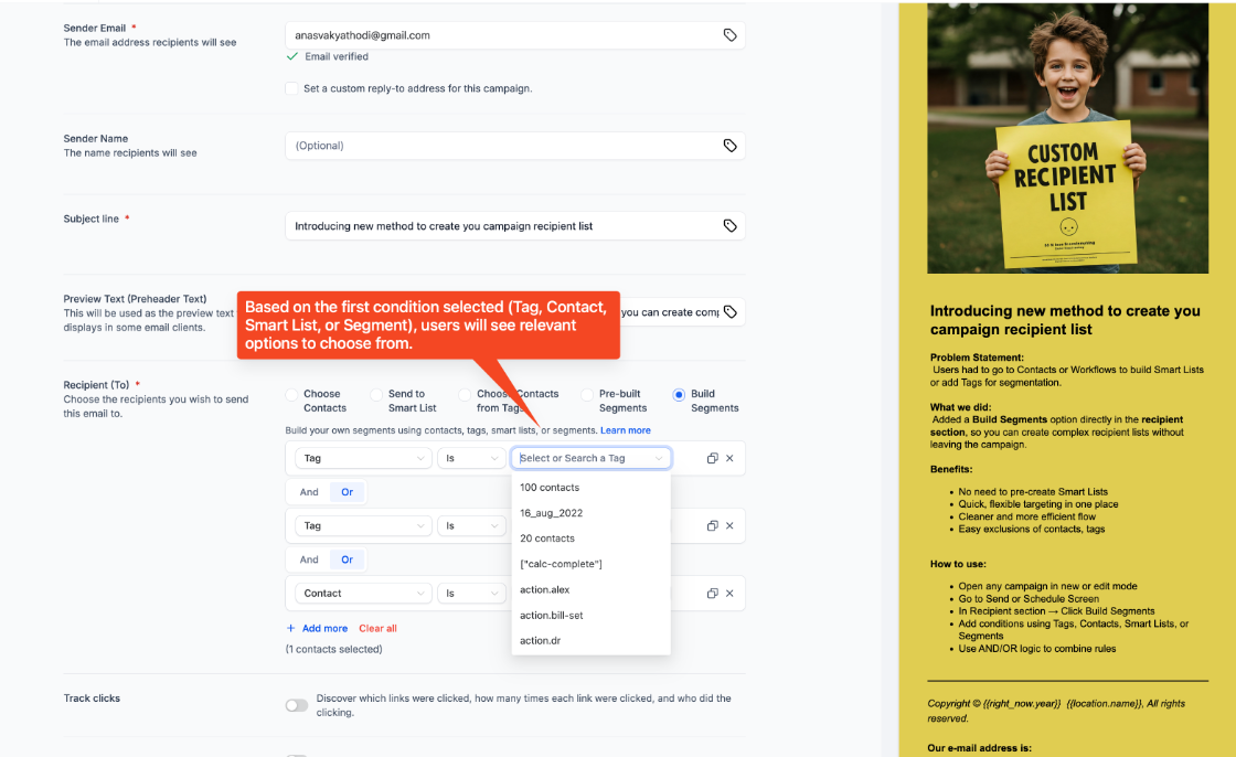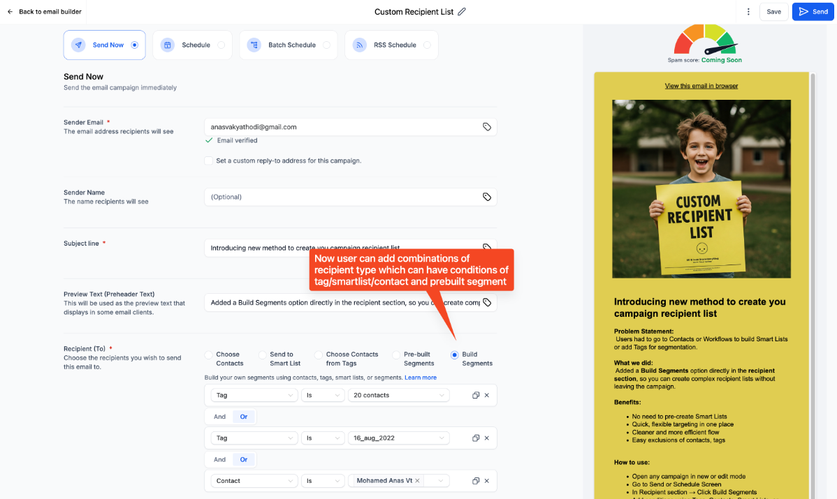 This allows users to build recipient segments directly within the email campaign, eliminating the need to pre-create Smart Lists or navigate to separate sections. Enables quick and flexible targeting for email campaigns, with easy exclusions based on tags, contacts, or segments.