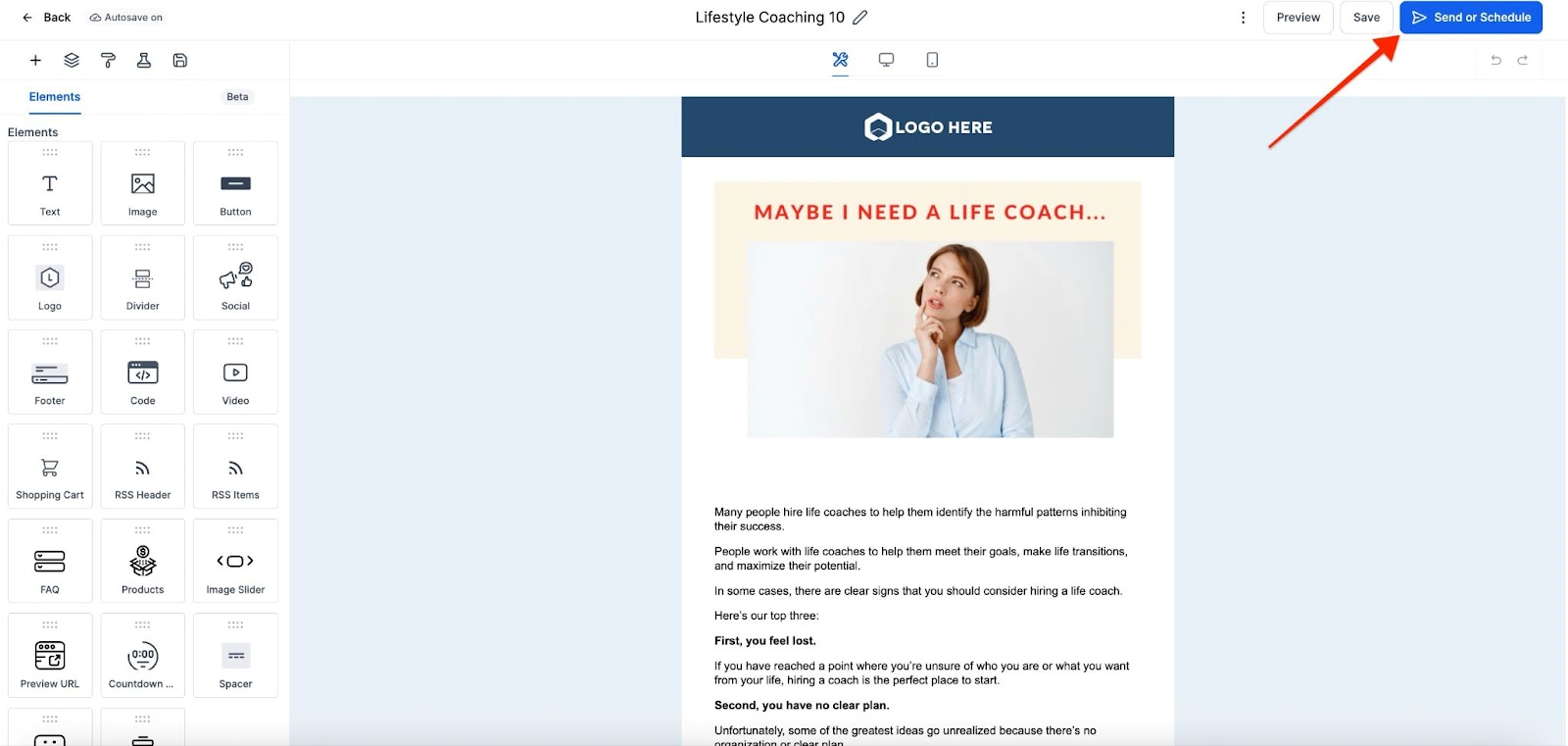 - Set up the campaign content and define the contacts you want to target. Once done, Click on "Send and Schedule"