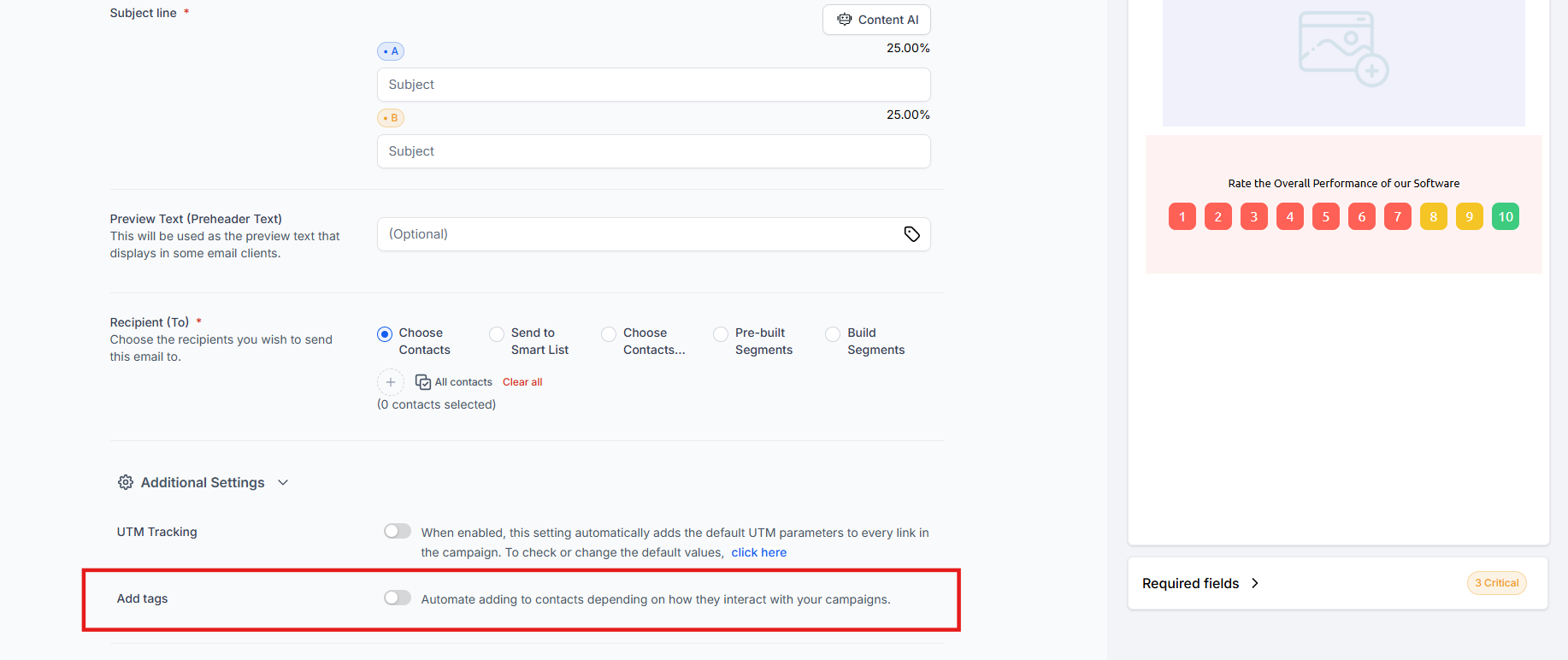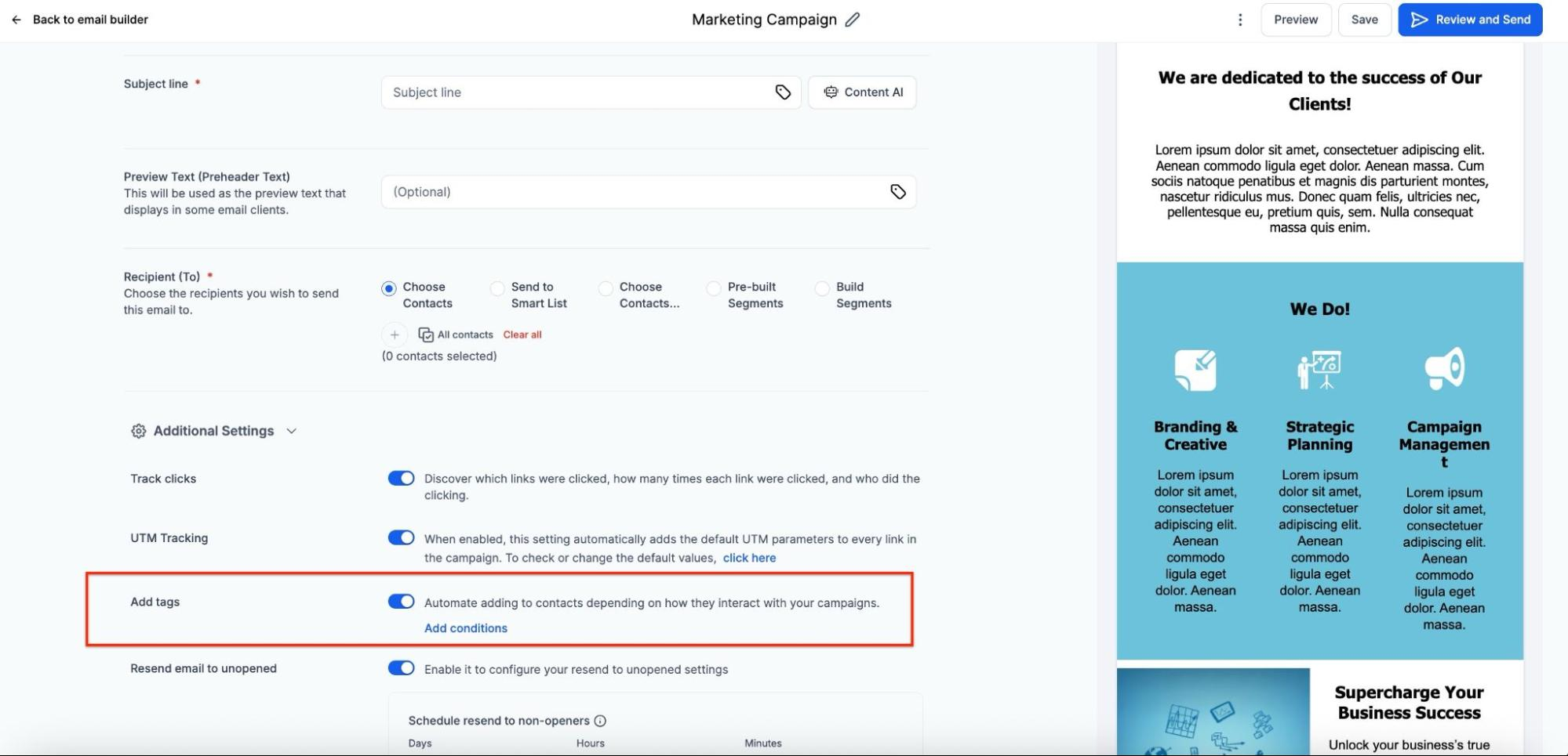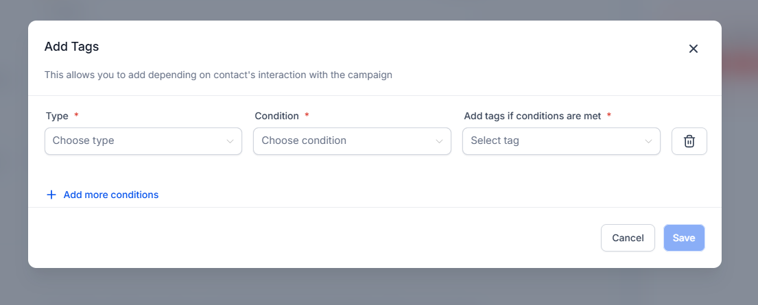 Implement automated tagging in your campaigns to track how contacts interact with your emails. In the "Send or Schedule" screen, turn on "Add Tags" and click “Add Conditions’’ to set up specific triggers based on recipient actions such as opens, clicks, replies, or unsubscribes.